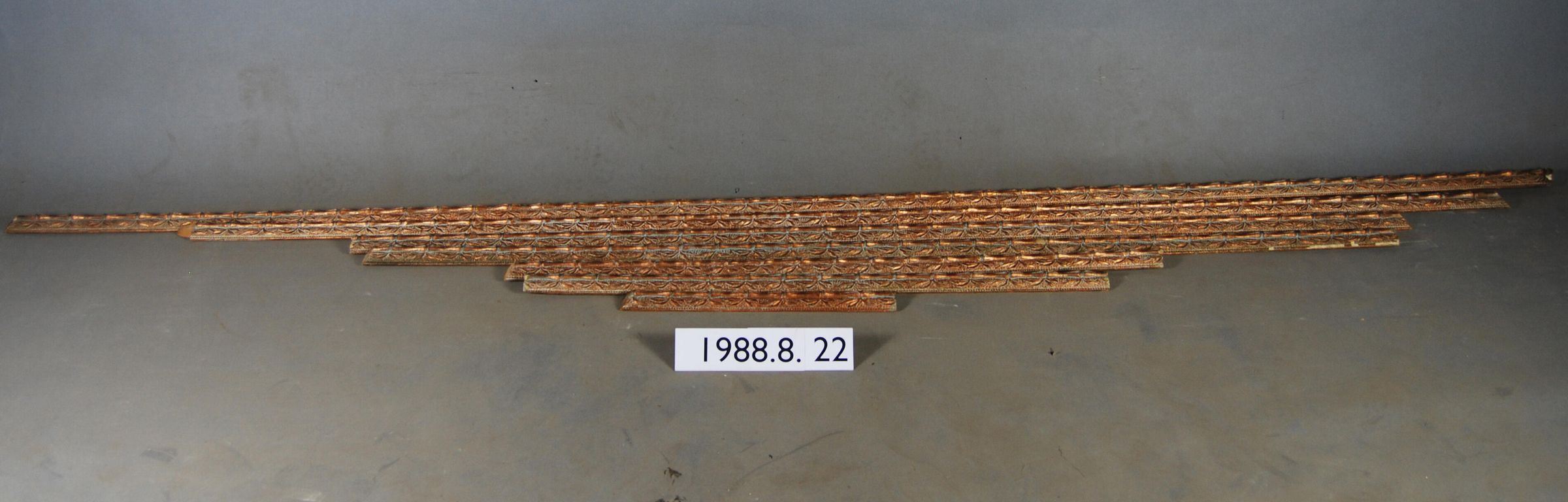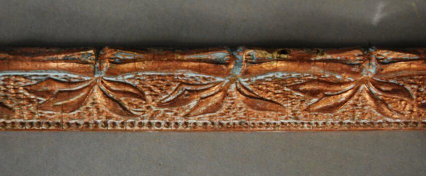 One lot of seven interior wood picture rail moldings, decorated with gesso. Botanical (bamboo) motif. Bronze paint finish.