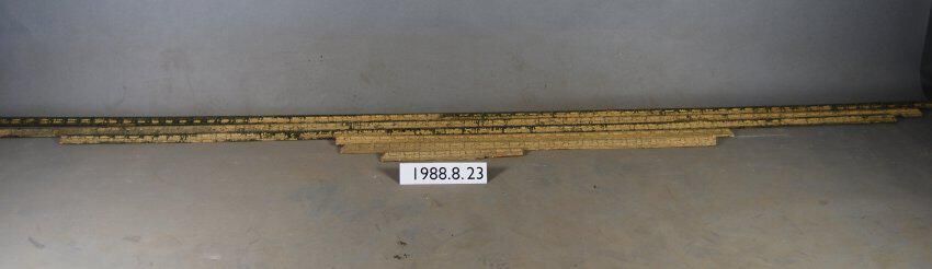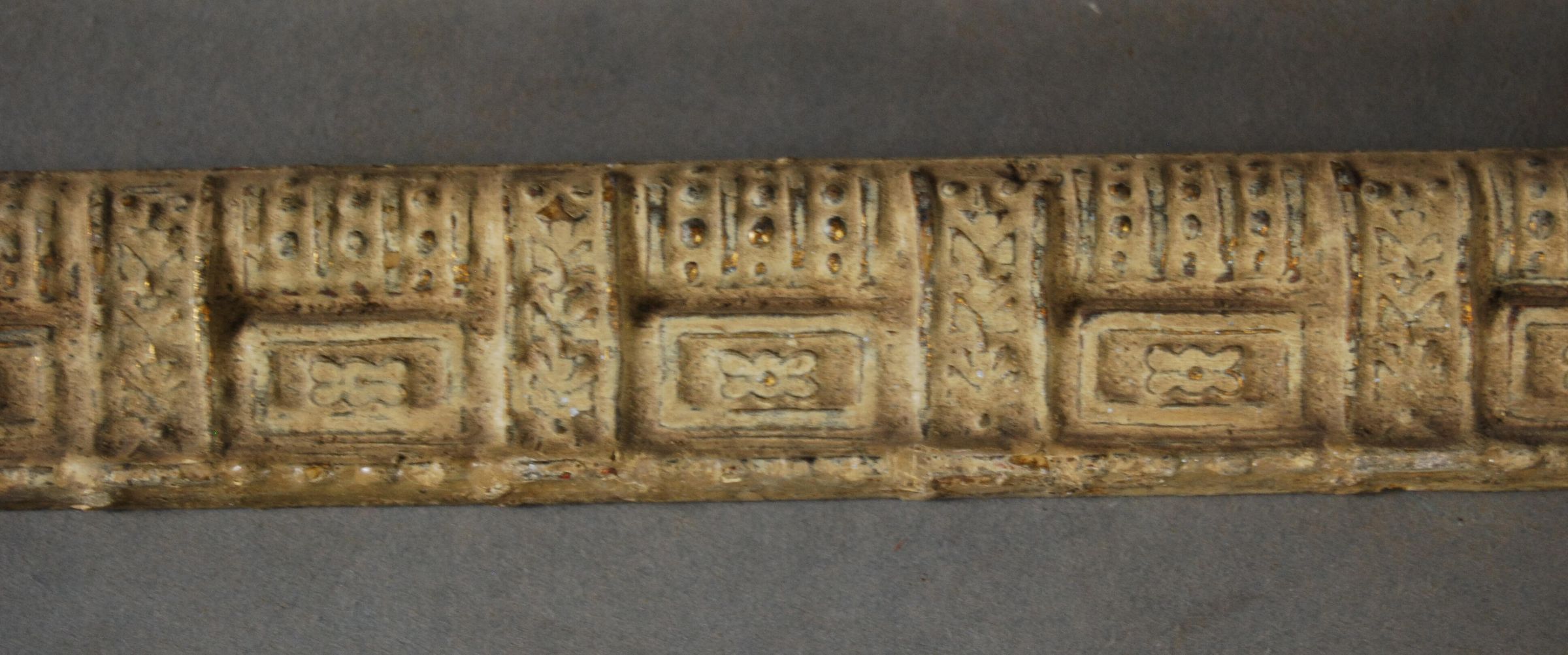 One lot of six interior wood picture rail moldings, decorated with gesso. Botanical motif. Original finish gilt,now green / beige paint.