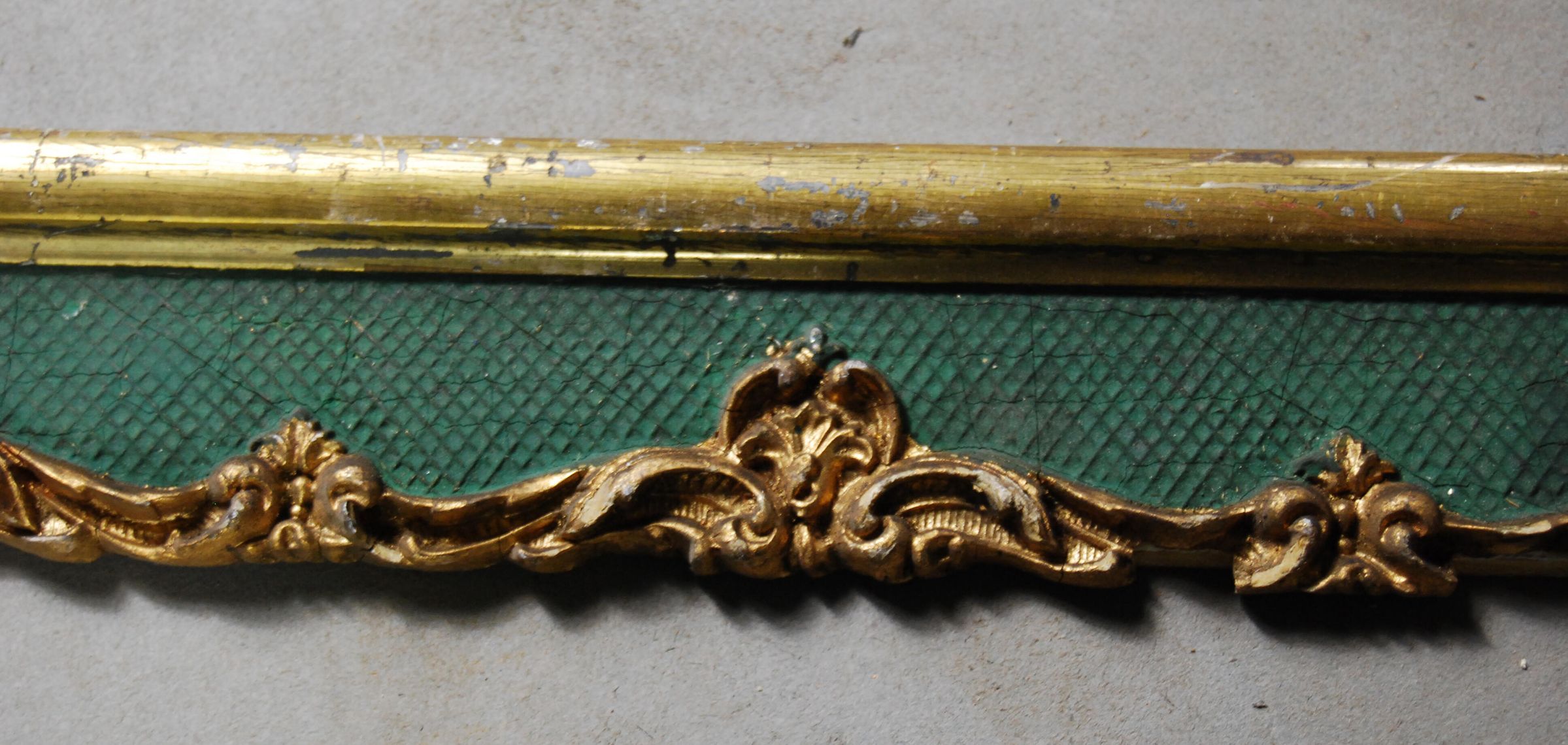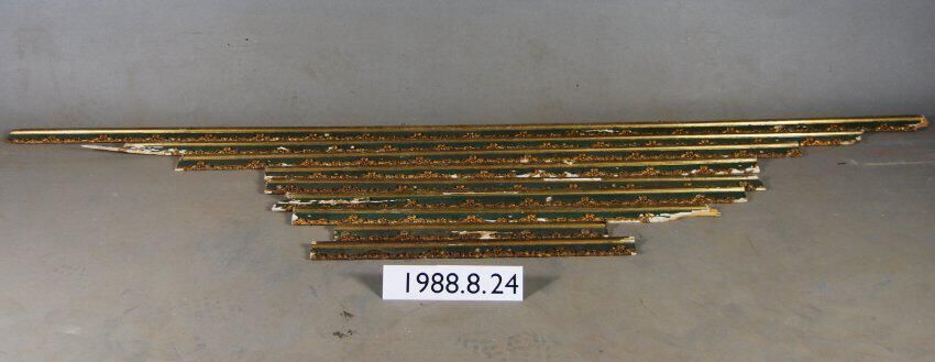 One lot of nine interior wood picture rail moldings, decorated with gesso. Botanical motif. Original finish gilt and green Some broken / missing elements.