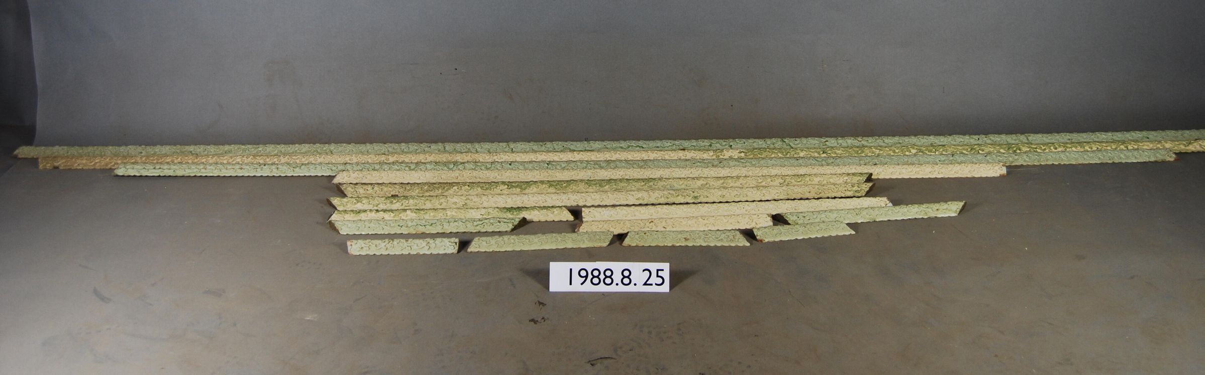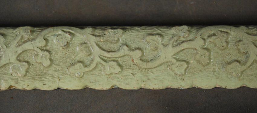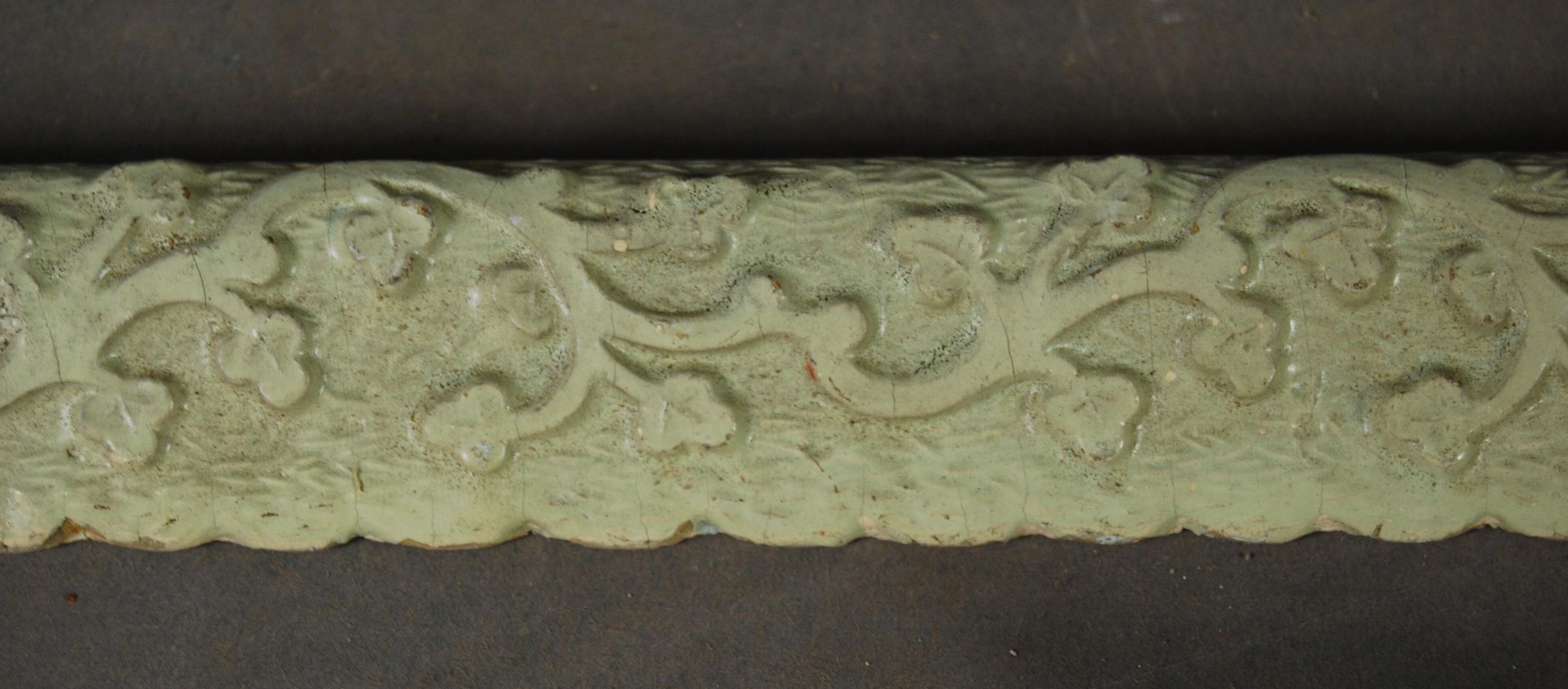 One lot of fifteen interior wood picture rail moldings, decorated with gesso. Botanical motif. Original finish gilt,now painted light green / beige.