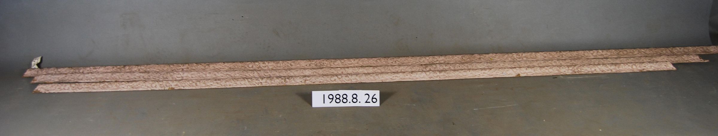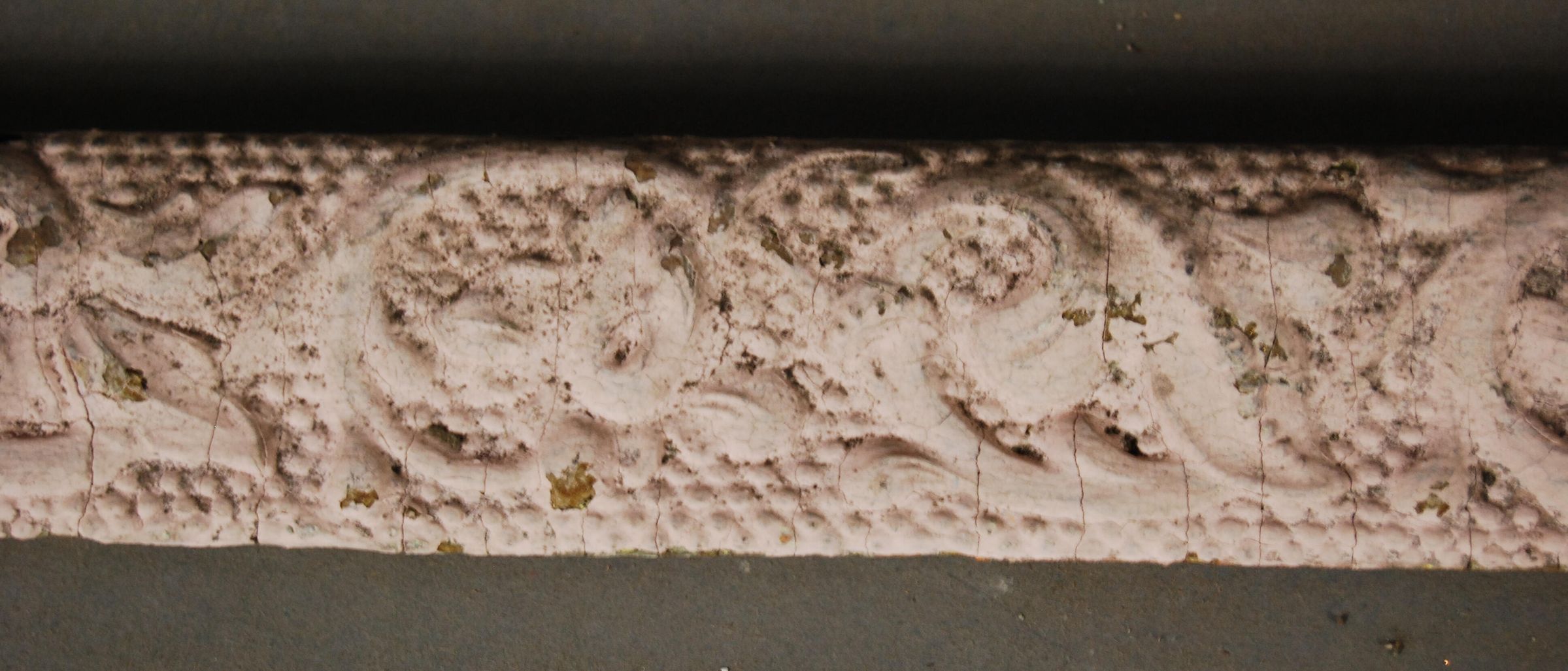 One lot of three interior wood picture rail moldings, decorated with gesso. Botanical motif. Original finish gilt, now painted beige.