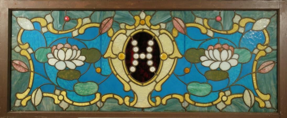 Material: Opalescent Glass; Crackle Glass; Rippled Glass; Numerous Jewels, faceted (approx. 20 count); Gilded Lead; cedar sashLexicon
