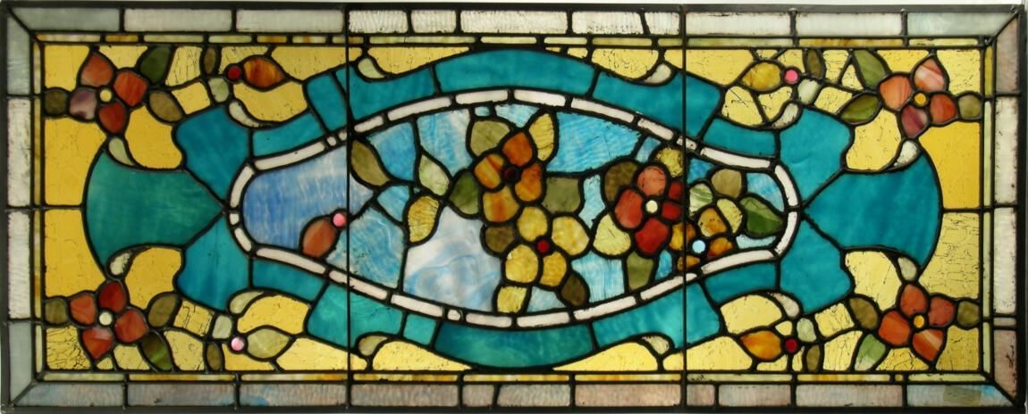 Shield Center; Dogwood Flowers ( multi-colored pink/gold); 13 Faceted Jewels (multi-colored); Blue, Lavendar, White Rippled Glass; Gold Crackle Glass; Turquoise Opalescent in Shield.