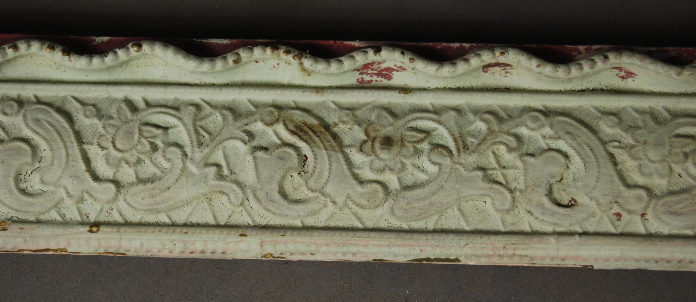 One lot of five interior wood picture rail moldings, decorated with gesso. Botanical motif. Original finish gilt,now painted green / beige.