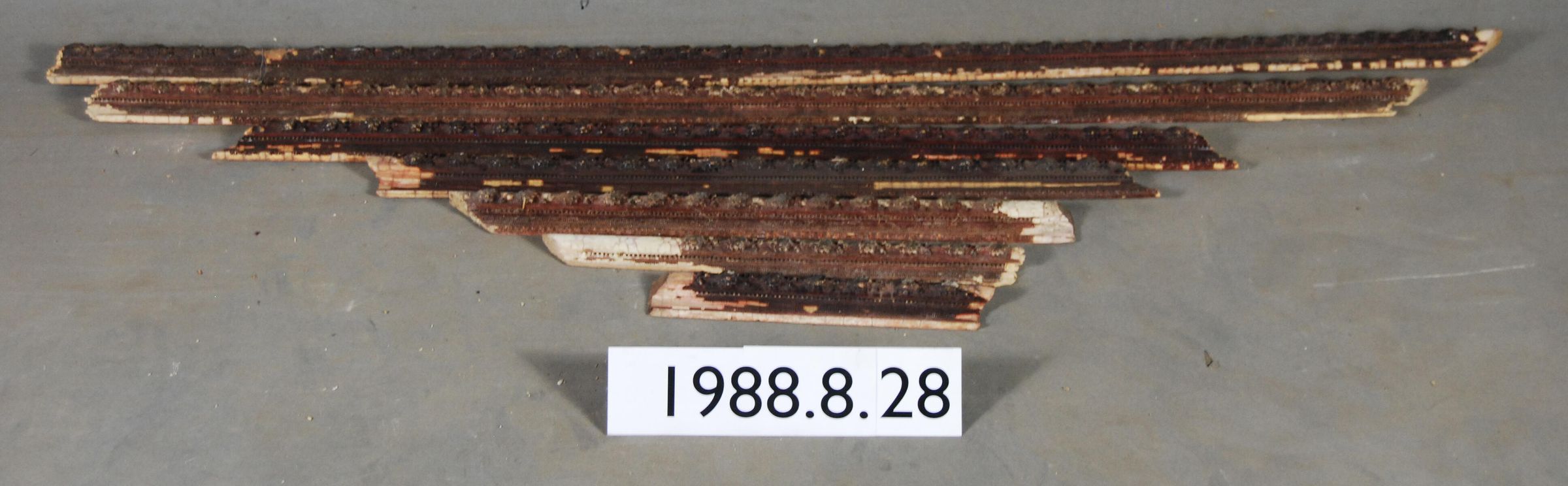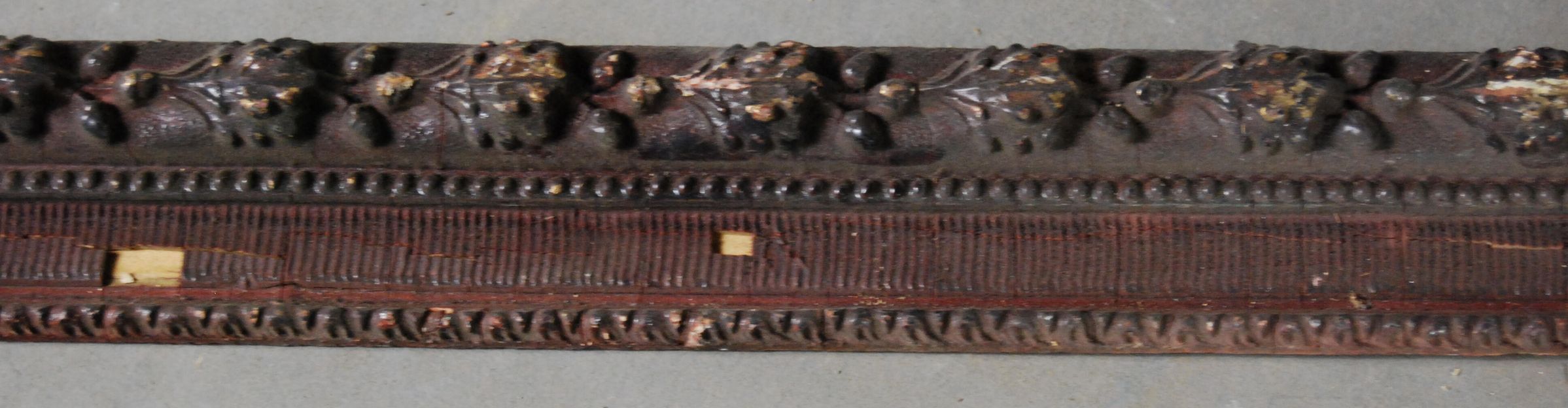 One lot of seven interior wood picture rail moldings, decorated with gesso. Botanical motif, Gilt / brown finish. Inscriptions or Markings: Manufacturer: Place of Manufacturer: Design motif: Botanical Style: Finish: Gilt / Brown finish.