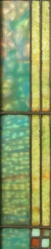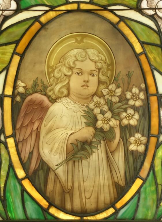 Painted Child surrounded by Easter Lillies; Church window, Center Section Plated; Inscriptions; Cathedral Arch Border.