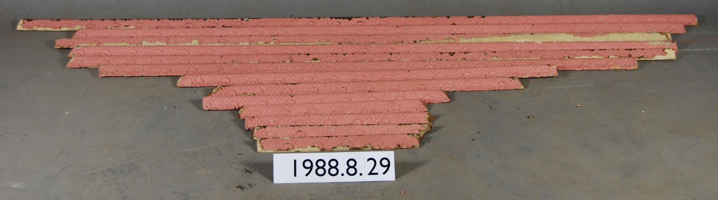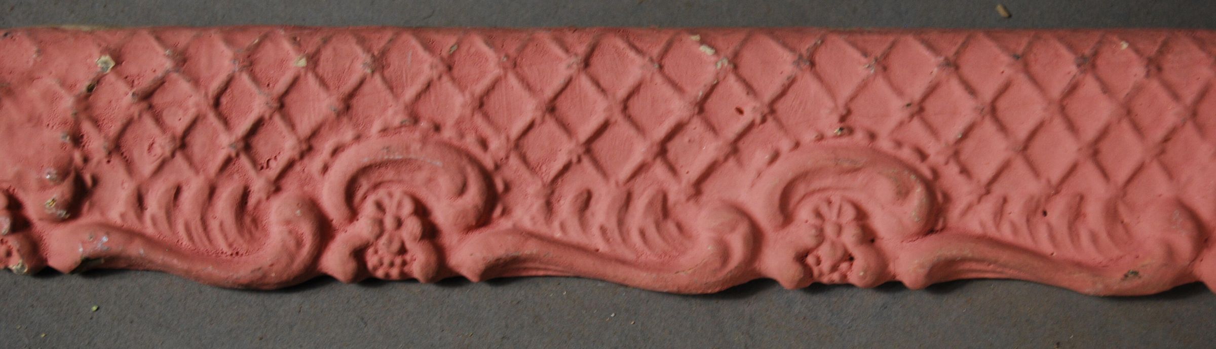 One lot of thirteen interior wood picture rail moldings, decorated with gesso. Botanical / geometric motif. Original finish gilt,now painted pink.