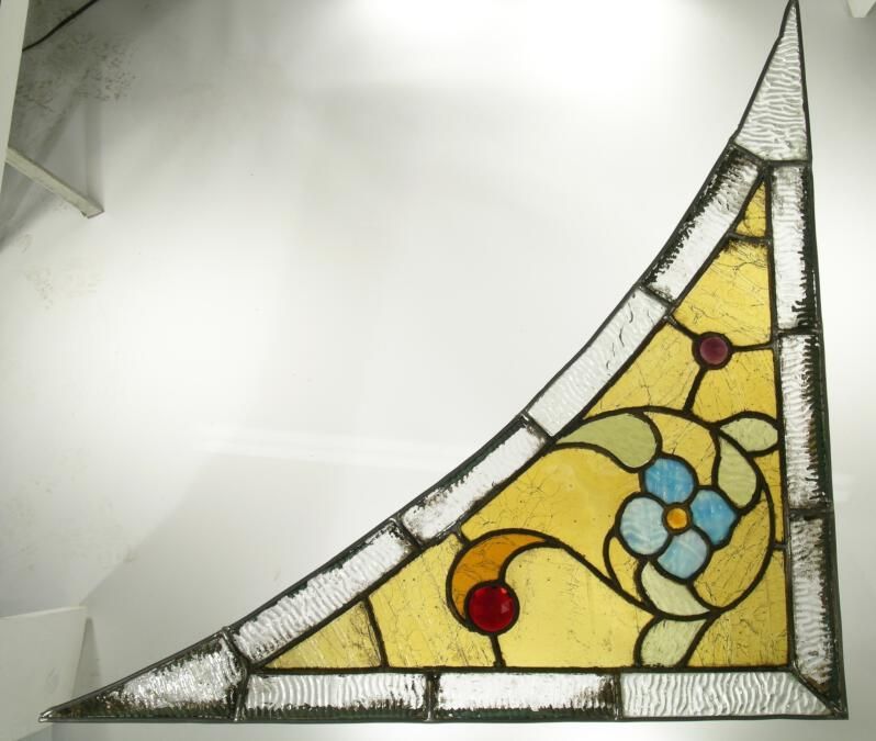 Corner section of larger Povey window (3 windows/6 sections) featuring Povey Blue Dogwood Flower and Flower Bud with Jeweled Tip.Lexicon