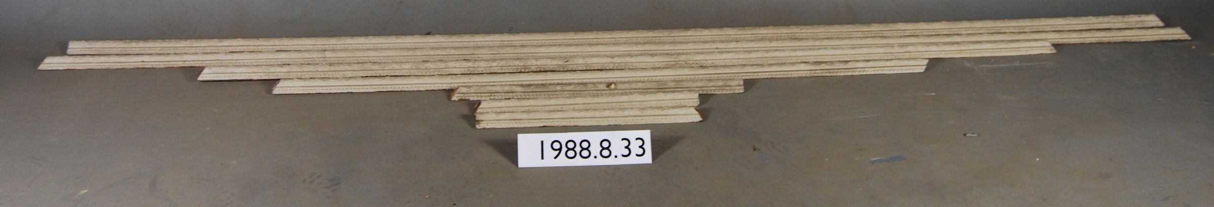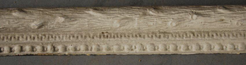 One lot of seven interior wood picture rail moldings, decorated with gesso. Faux bois motif with beaded edge - Greek key variation. Original finish bronze,now painted beige. Considerable deterioration of ornamentation.