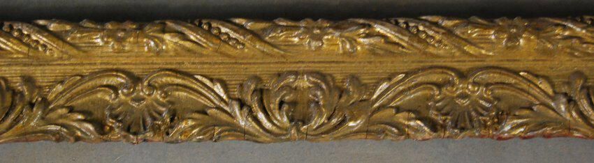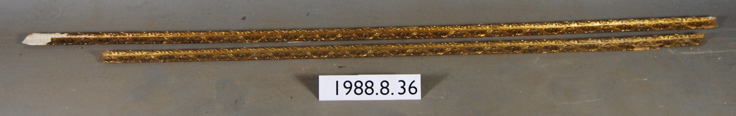 One lot of two interior wood picture rail moldings, decorated with gesso. Botanical leaf motif. Finish gilt with varnish.