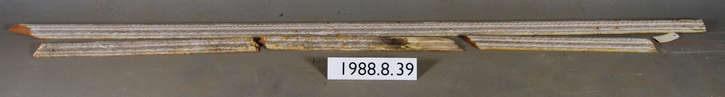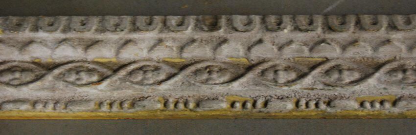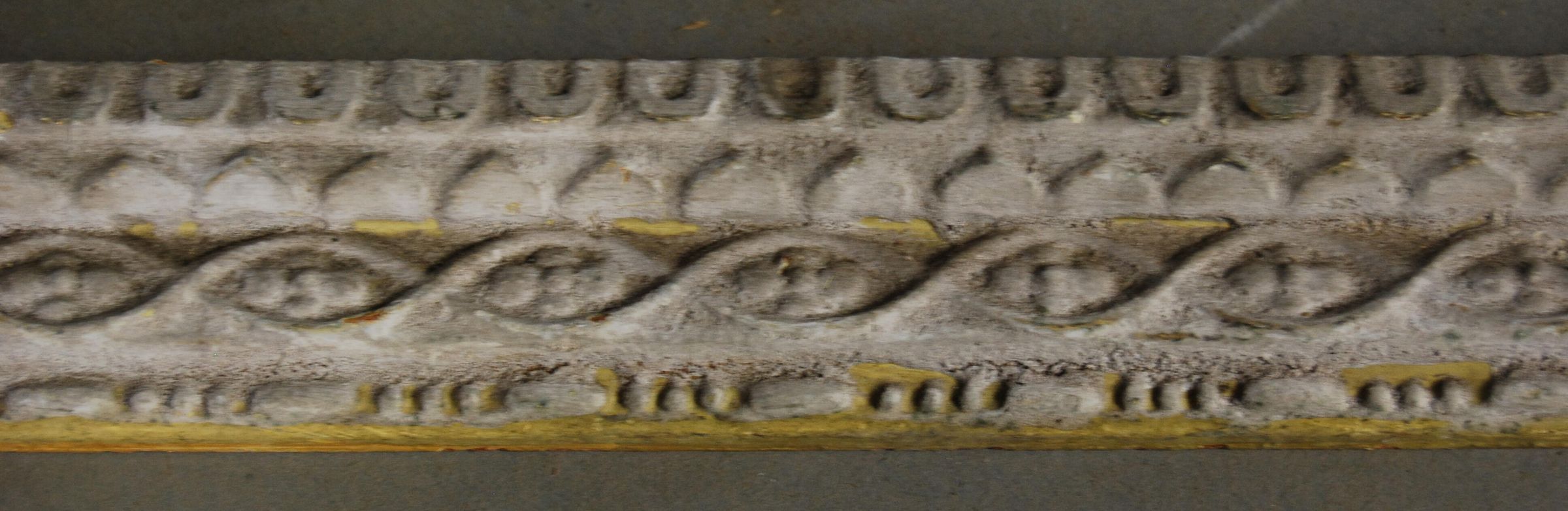 One lot of four interior wood picture rail moldings, decorated with gesso. Geometric with small botanical motif. Original finish gilt,now painted gray.
