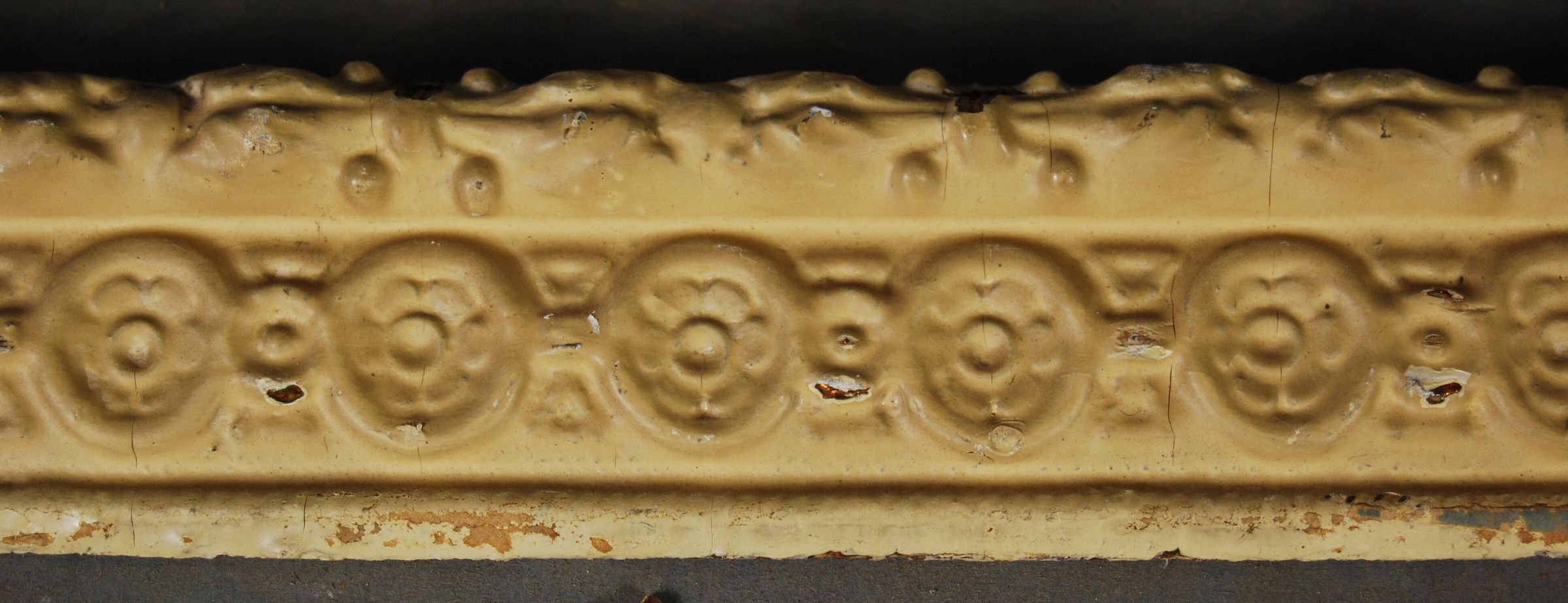 One lot of three interior wood picture rail moldings, decorated with gesso. Geometric with botanical motif. Original finish gilt,now painted cream.