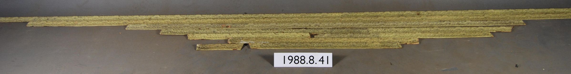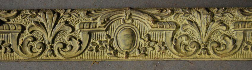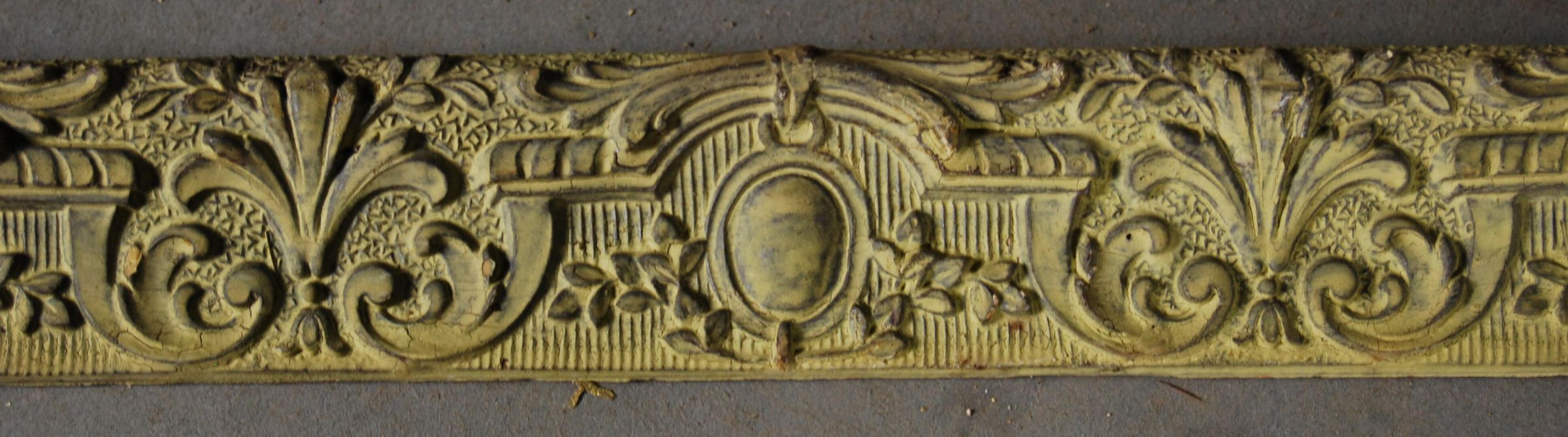 One lot of nine interior wood picture rail moldings, decorated with gesso. Botanical leaf with cartouche motif. Original finish brown,now painted green