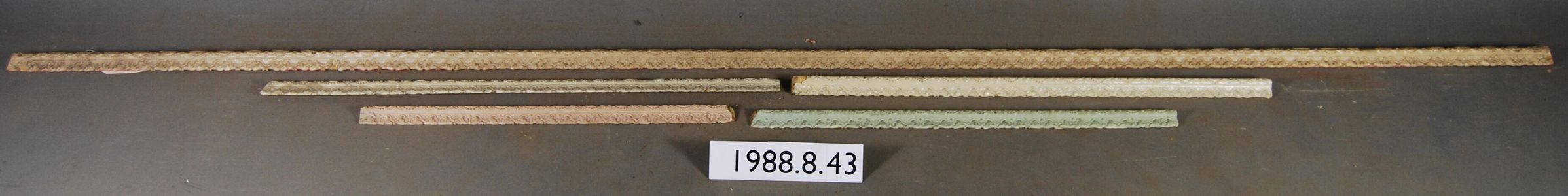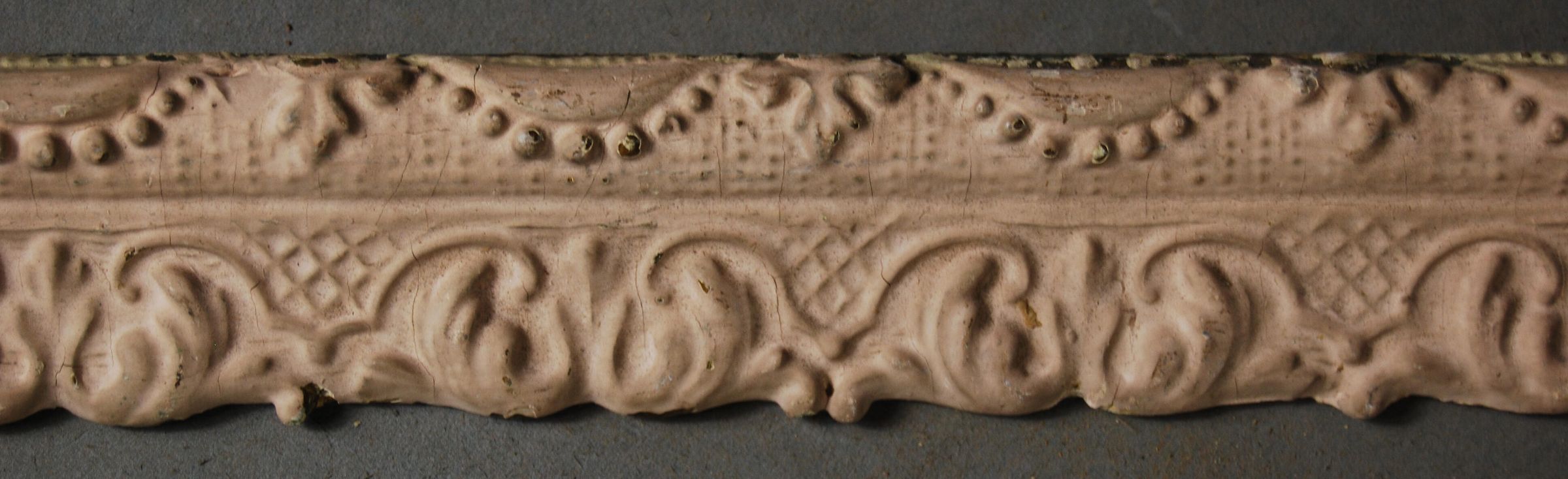 One lot of five interior wood picture rail moldings, decorated with gesso. Botanical leaf and garland motif. Original finish gilt,now painted beige, pink, cream, pale green