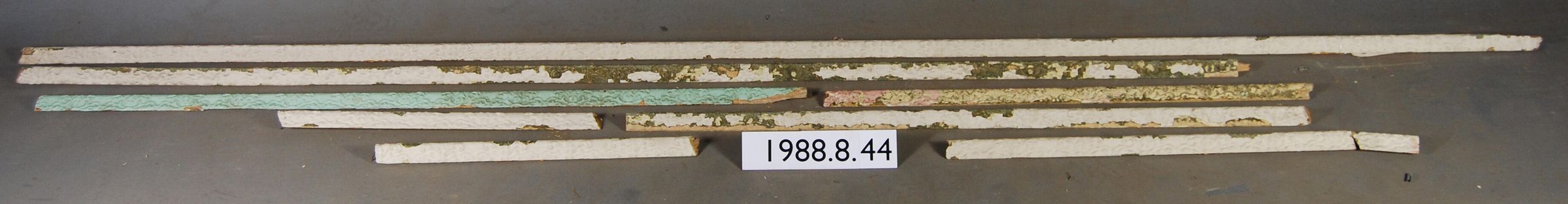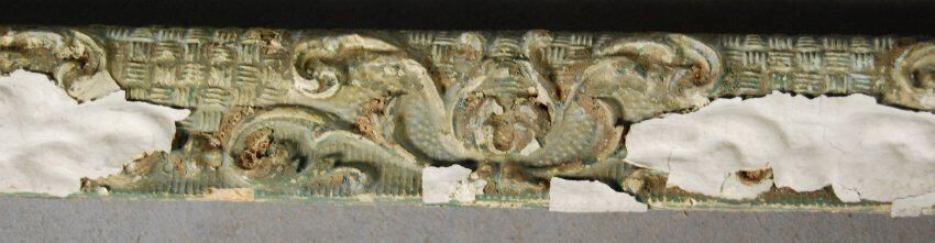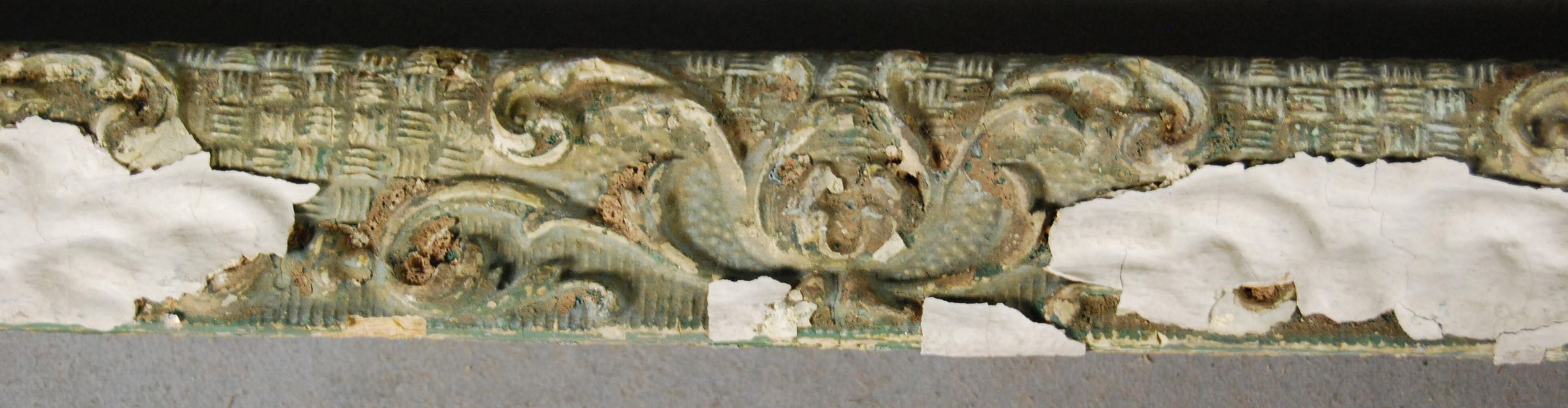 One lot of eight interior wood picture rail moldings, decorated with gesso. Large botanical leaf motif. Original finish gilt,now painted white and green.
