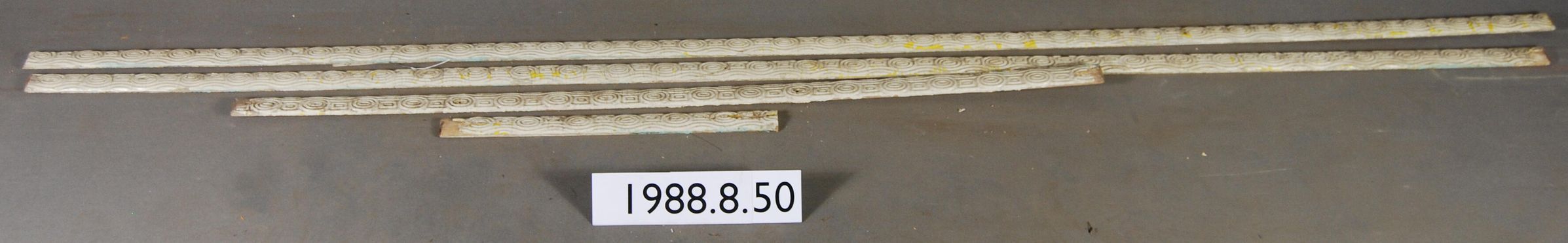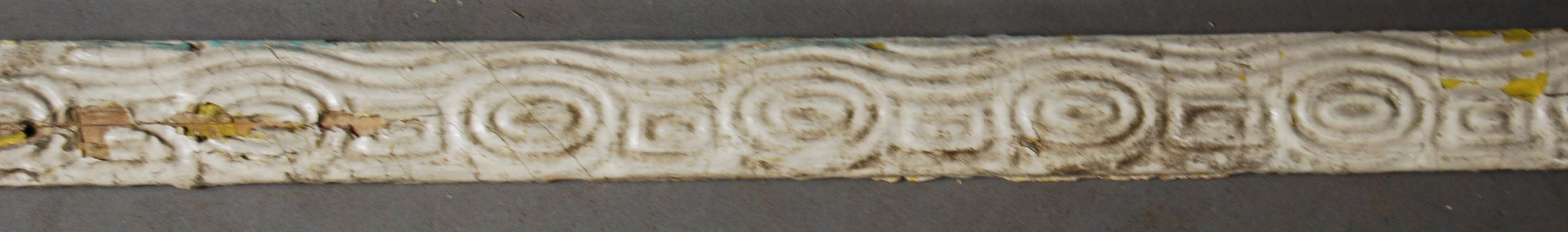 One lot of four interior wood picture rail moldings, decorated with gesso. Geometric motif with wave pattern. Original finish undetermined,now painted white.