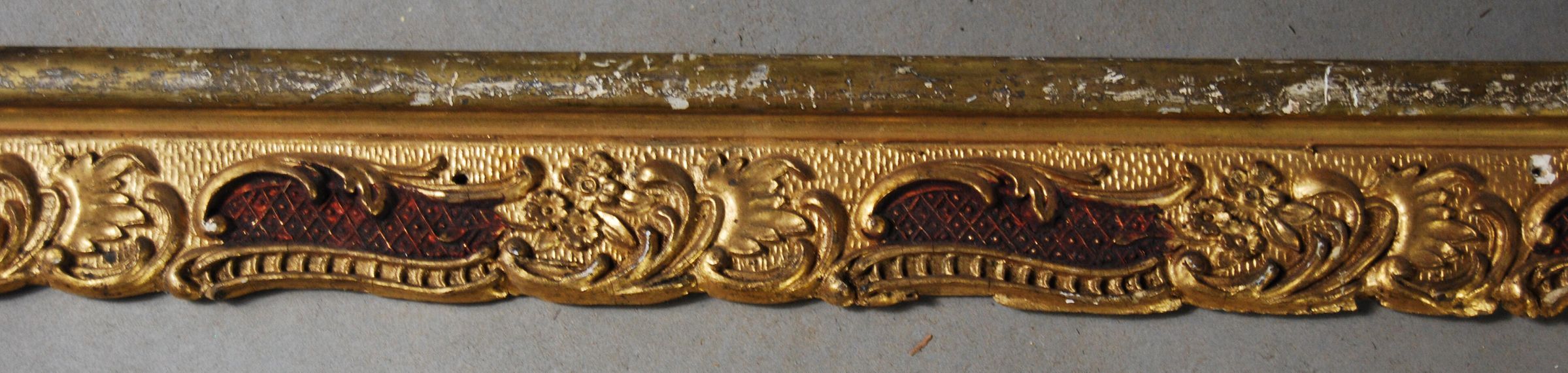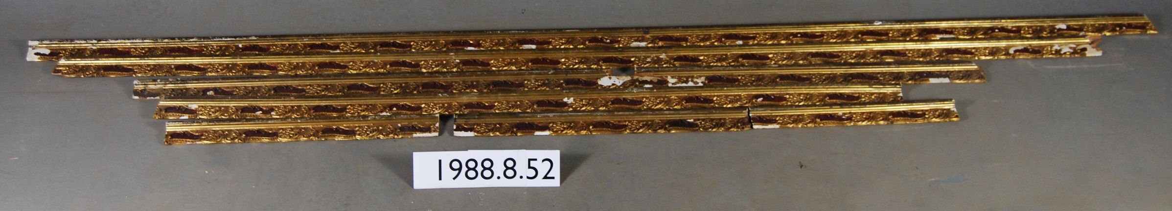 One lot of seven interior wood picture rail moldings, decorated with gesso. Botanical motif with plain top rail.. Original finish gilt with maroon accents.