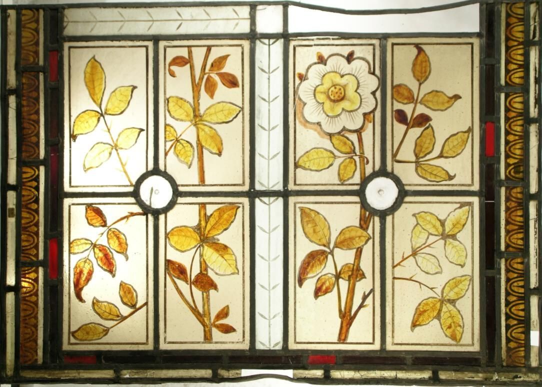 European style; Silverstained Leaves; Clear Rondels; 8 Floral Panels (Rose); Egg and Dart Border; Flashed Glass Border.