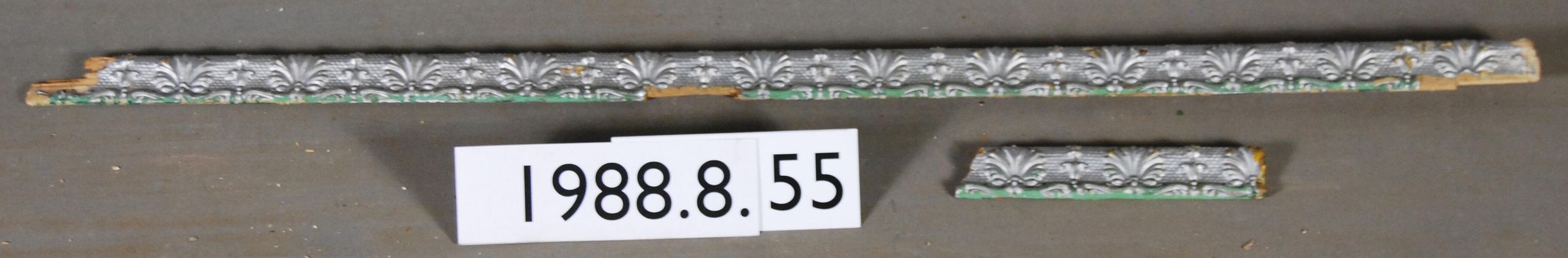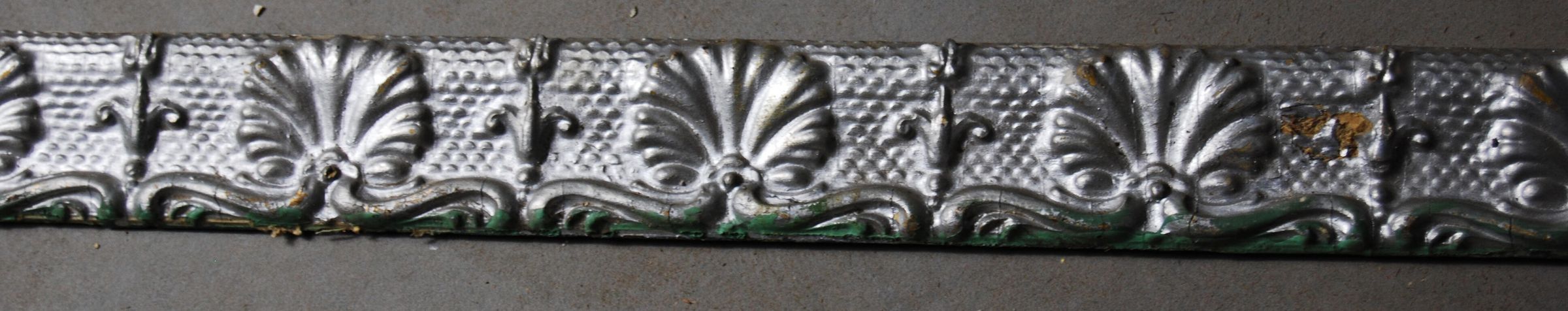 One lot of two interior wood picture rail moldings, decorated with gesso. Botanical motif. Original finish gilt,now painted aluminum color.