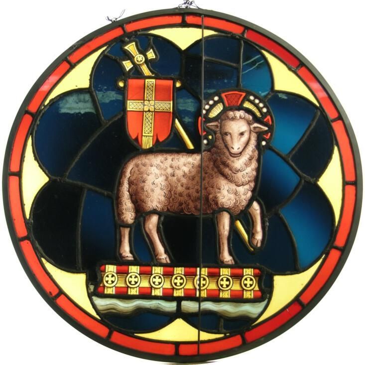 Features painted Lamb of God and various religious symbols and shield. Round stained glass and painted church window.