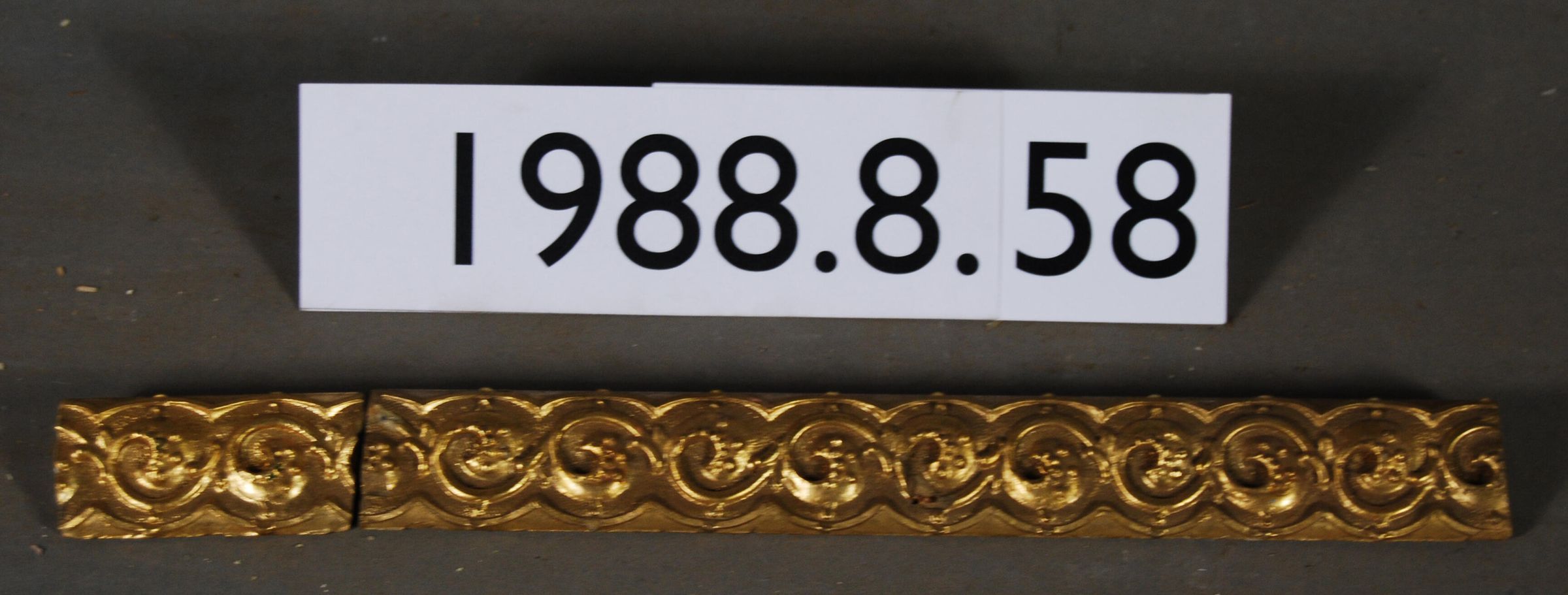 One lot of two interior wood picture rail moldings,decorated with gesso. Botanical motif, original finish gilt. Inscriptions or Markings: Manufacturer: Place of Manufacturer: Design motif: Botanical Style: Finish: Original finish Gilt.