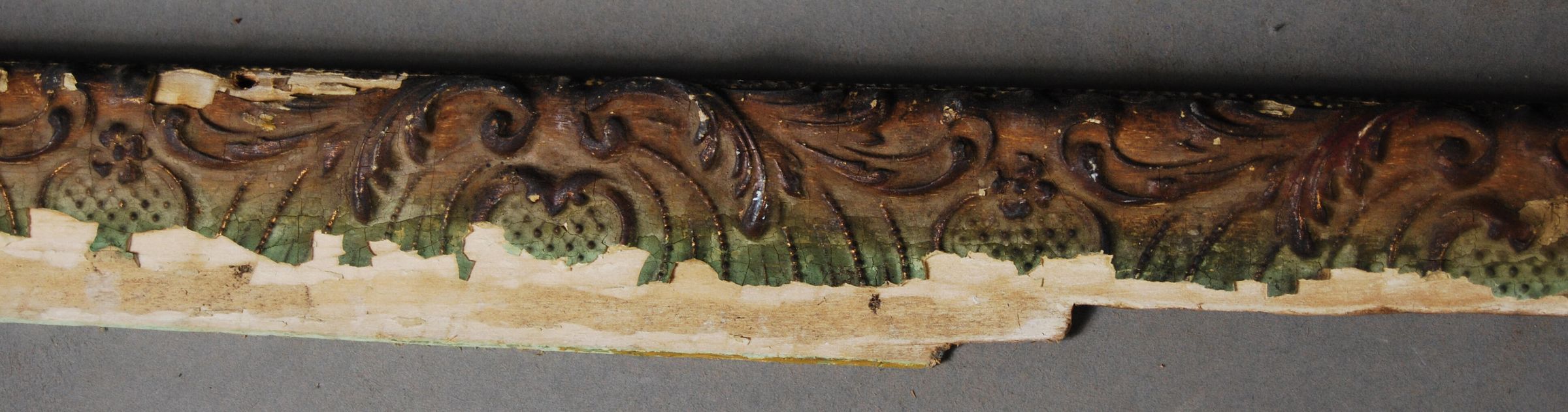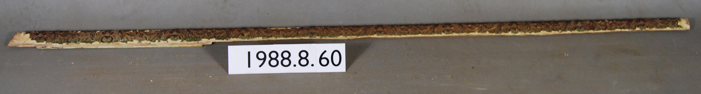 One interior wood picture rail molding, decorated with gesso. Botanical motif. Original finish reddish,now painted brown / green.