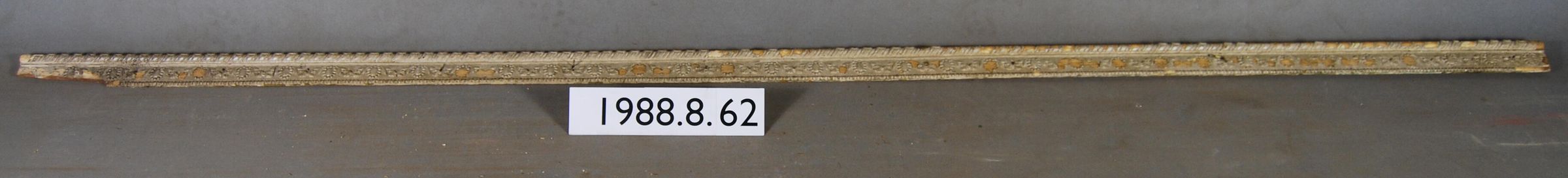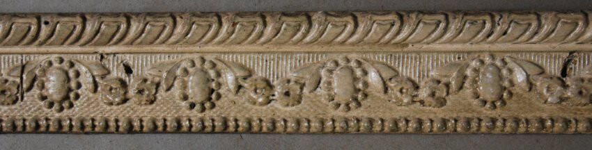 One interior wood picture rail molding, decorated with gesso. Botanical motif. Original finish undetermined,now painted off-white.