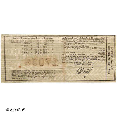ONE HUNDREDTH part of the Bond of said number for Drawing No. 67, to be held in Havana on July ninth, nineteen sixty. The titles will be paid according to the official list authorized by the General Directorate. Prizes will not be paid without the presentation of the Bond. Winning Bonds may be cashed at the Institute's Paying Office. This Drawing consists of 40,000 Bonds, divided in hundredths of 22 cents the fraction for the official purchaser.