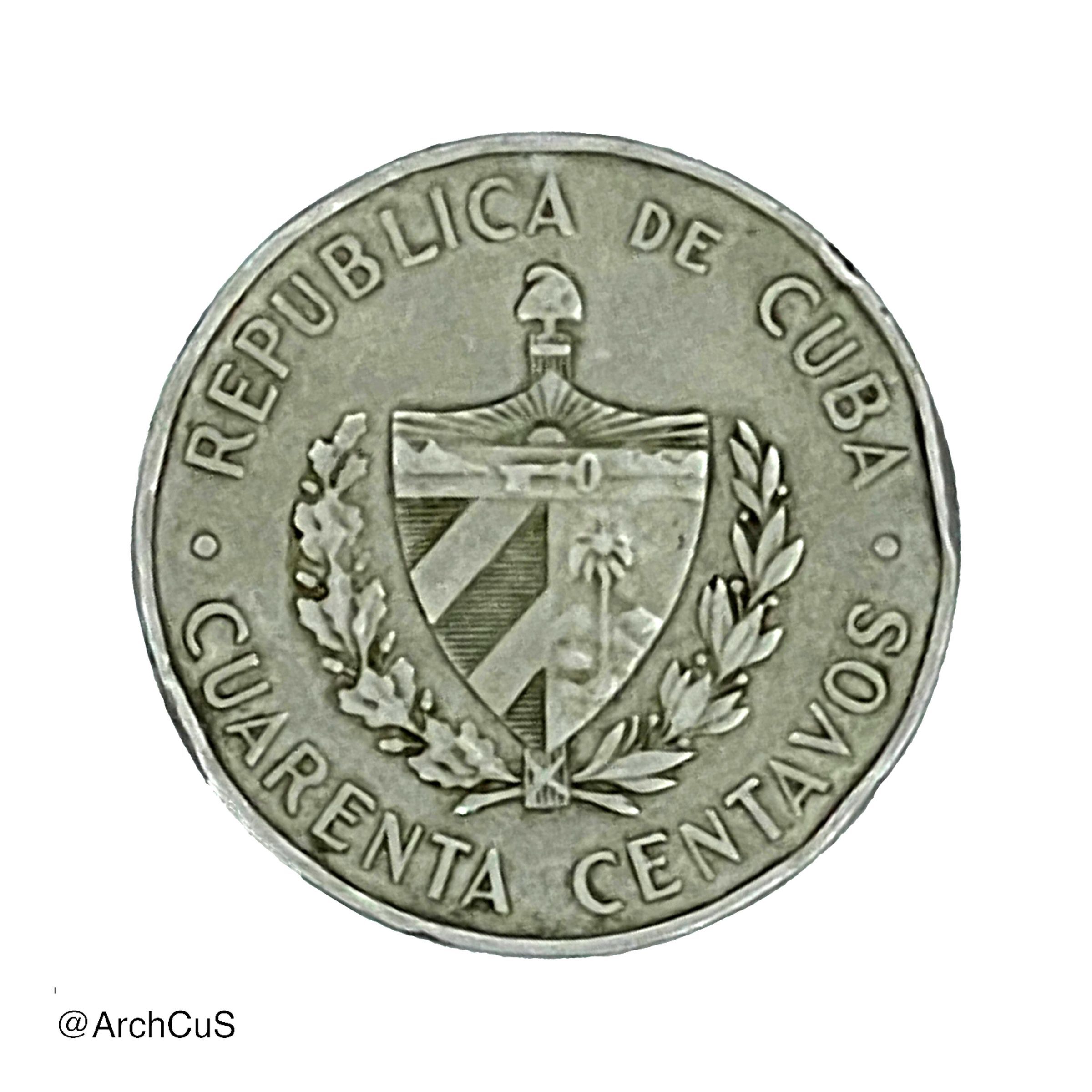 Cuban coat of arms, country name as curved legend on top, face value in letters as curved legend on bottom.Transcription