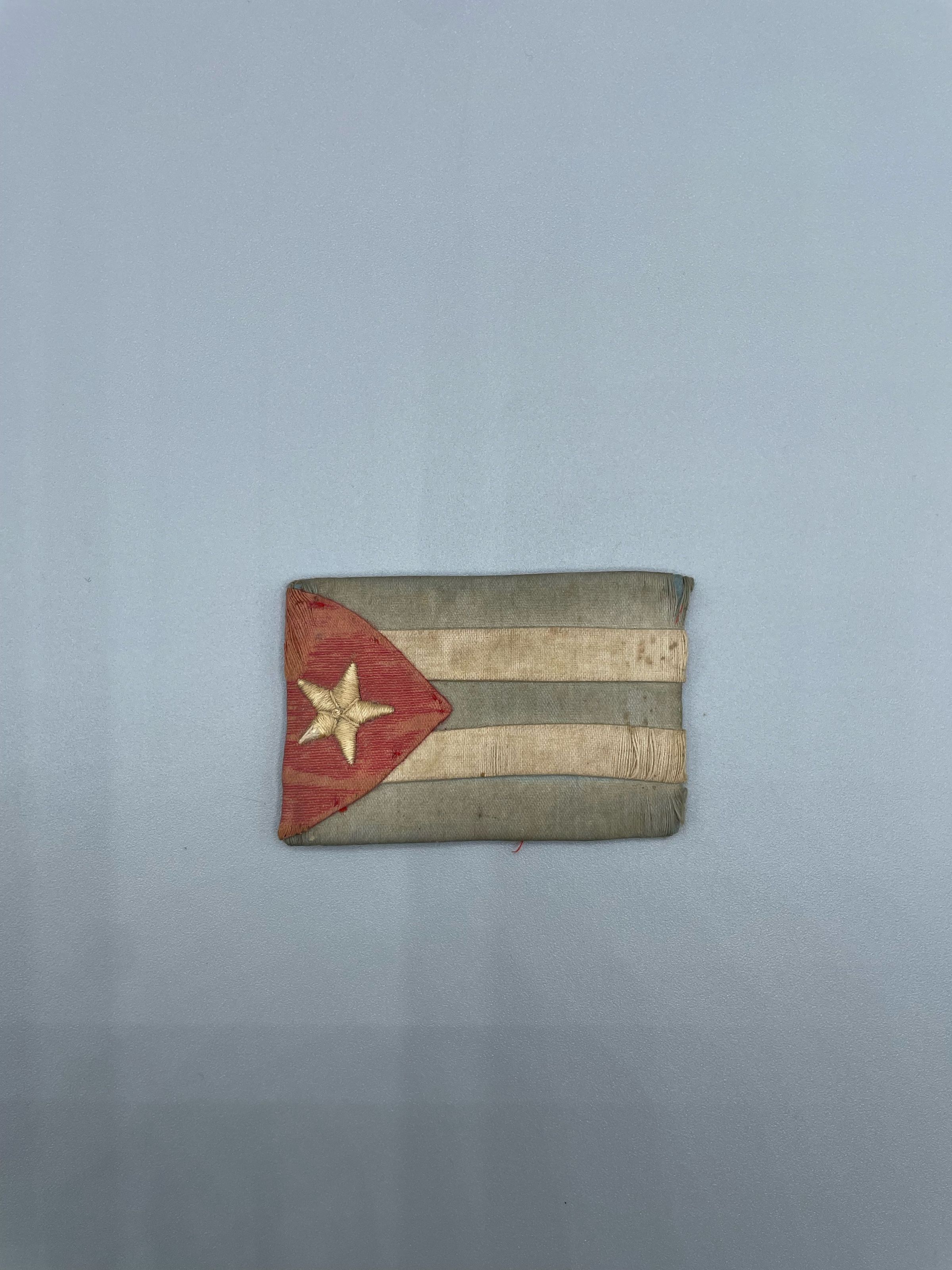 A handmade Cuban flag, possibly worn as a pin. An example of domestic nationalist craftsmanship probably from the early revolutionary years.Collection