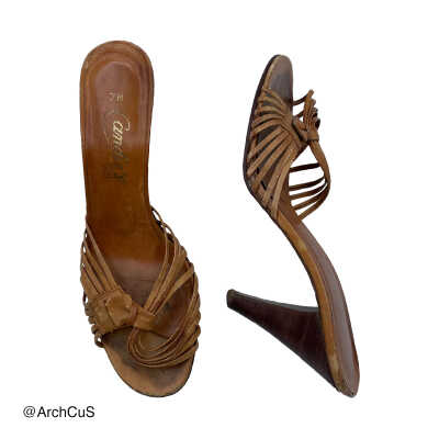 Brown leather Candie’s sandals with tan leather soles and wood-imitation heelsContext
