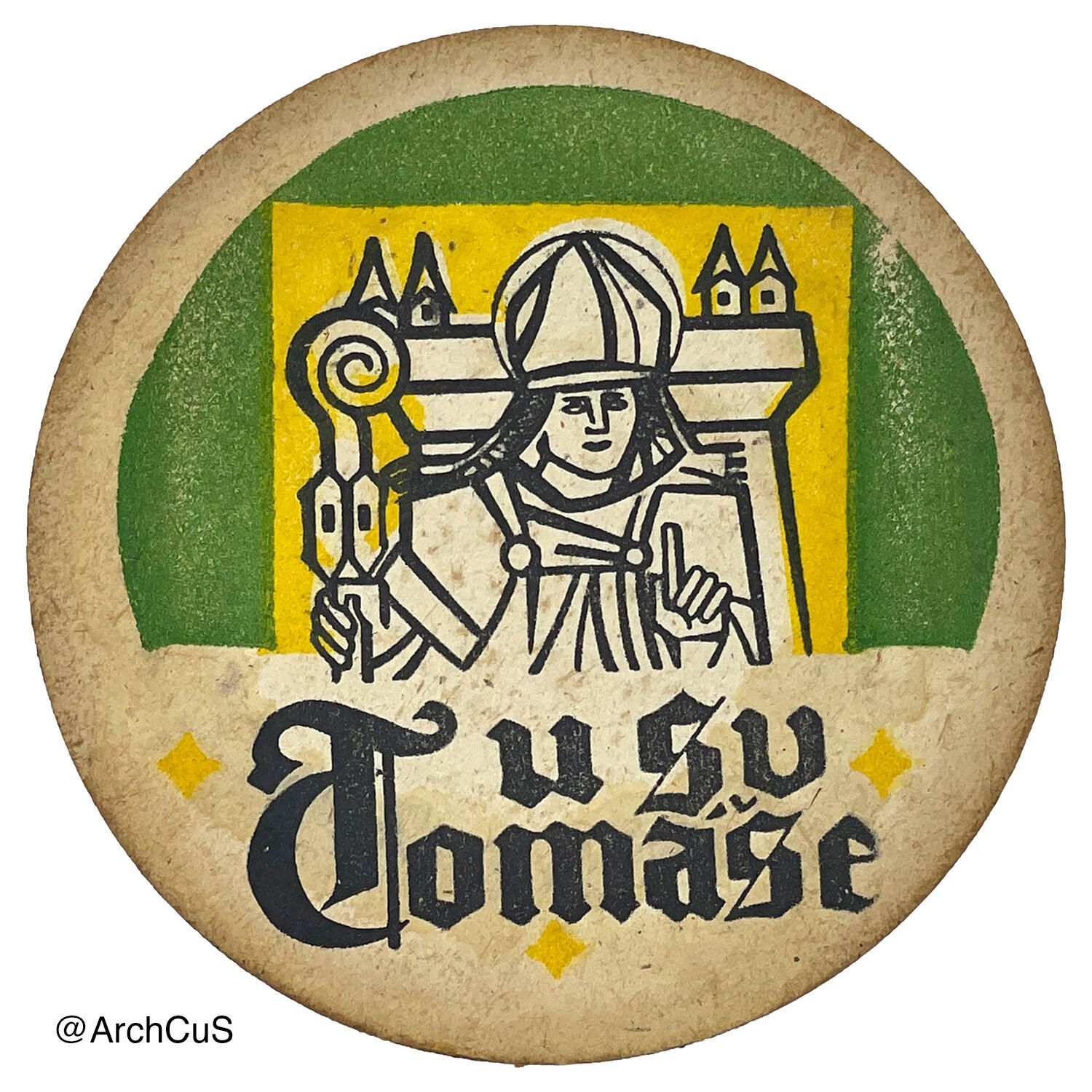 According to a coaster collector, U Sv. Tomáše was a traditional pub in Prague that closed in the mid-20th century. The Sv. Tomáše brewery is likely related to the St. Thomas Church in Malá Strana, Czechoslovakia. Until 1951, the monastery brewed beer. According to a Prague travel guide, U Sv. Tomáše is still open and a tourist attraction, although once served the Czech elite.