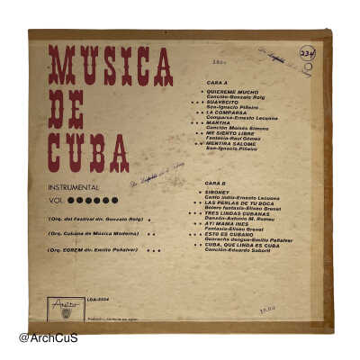 Musica de Cuba is a compilation album of songs written and performed by various Cuban artists and orchestras released under Areito, a record label from EGREM.
