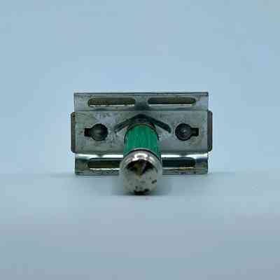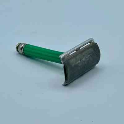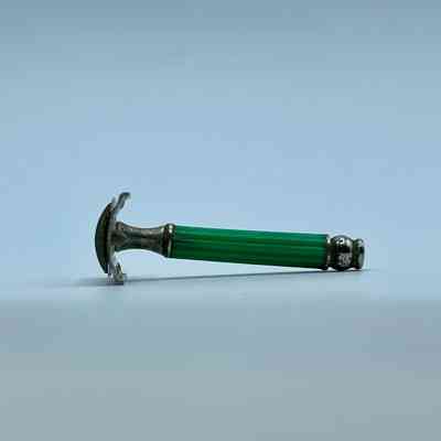 3-piece double-edge (DE) Flying Eagle safety razor with short screw and closed comb, in chromed metal and green plastic.Context