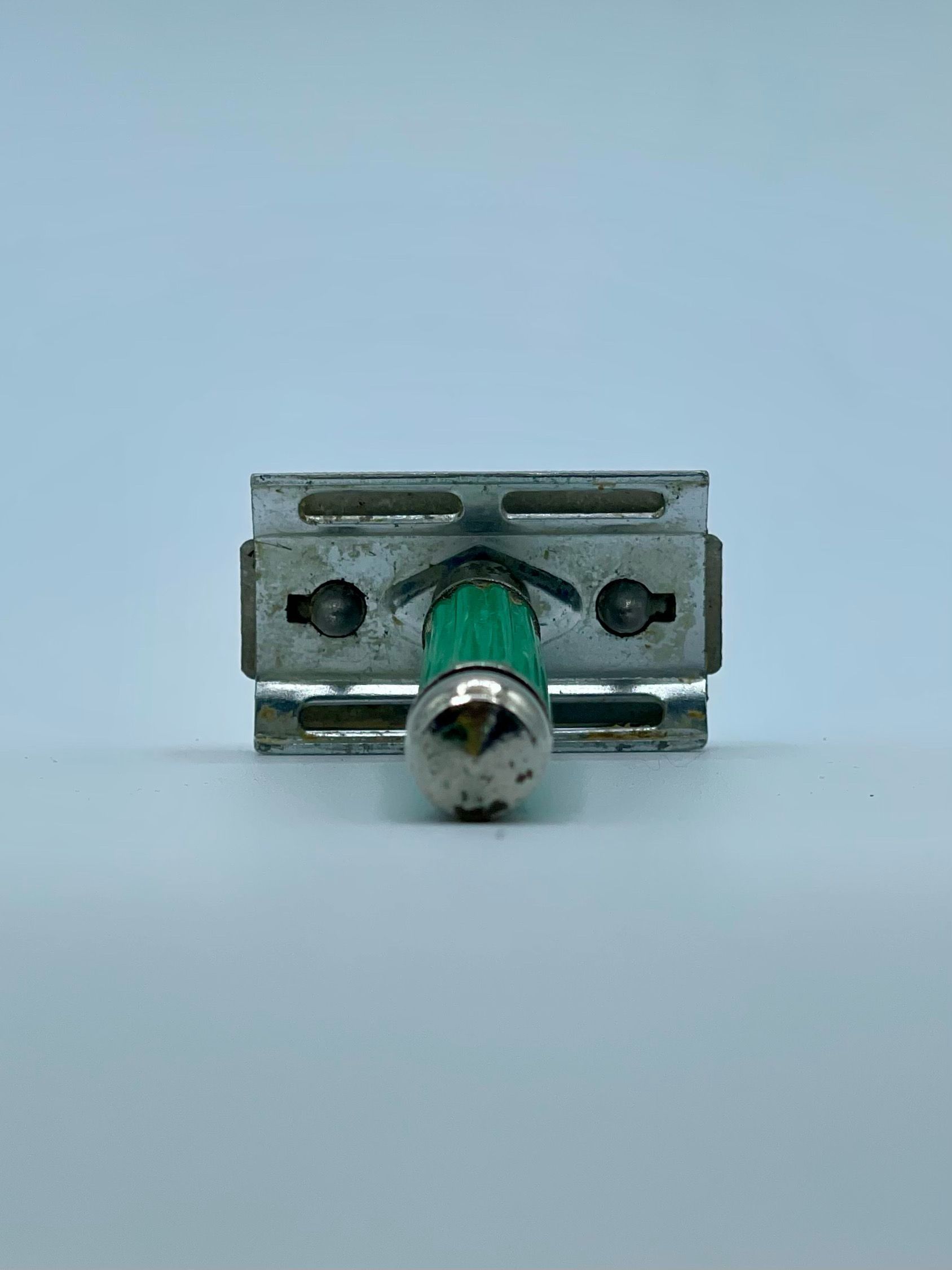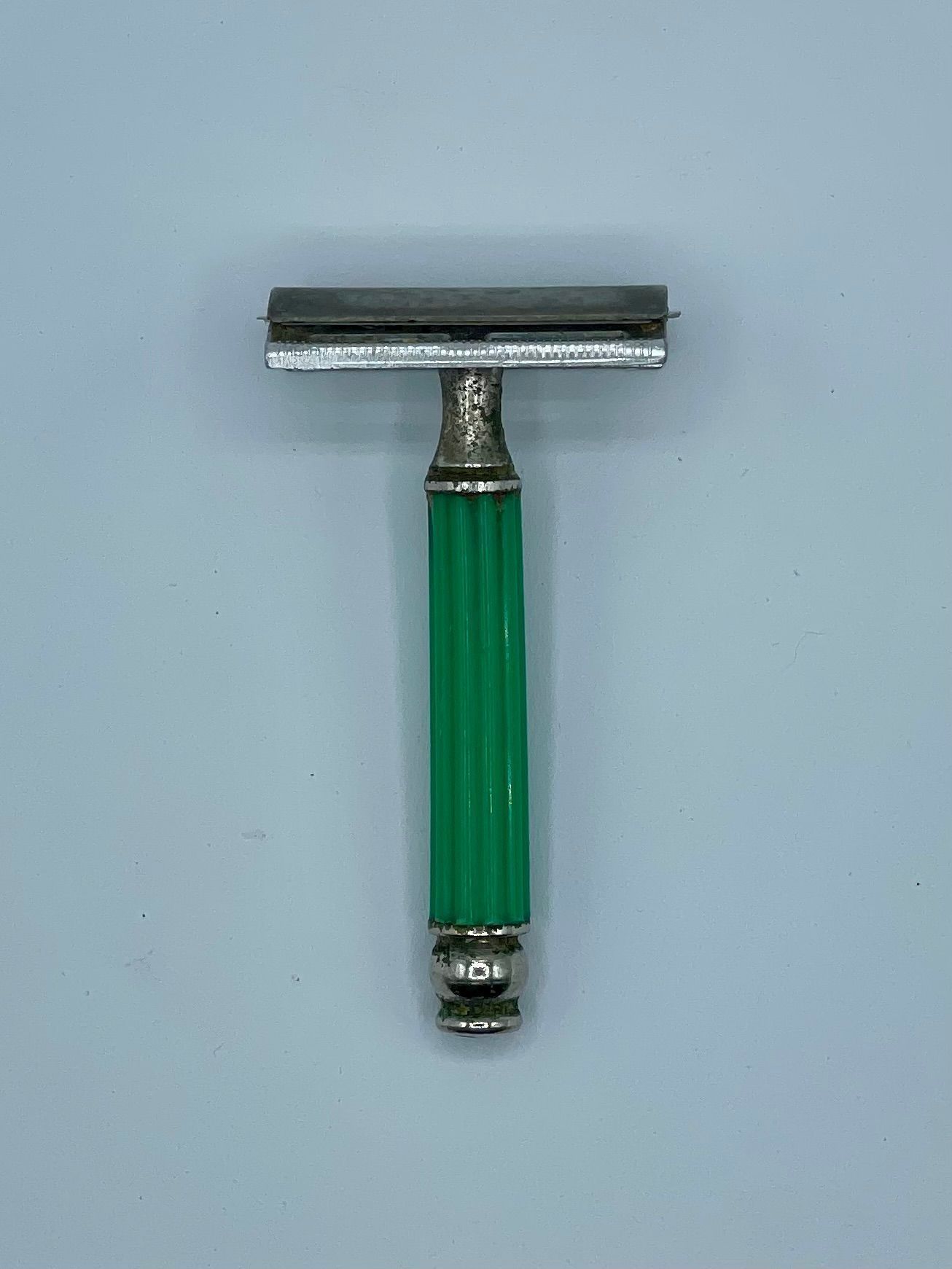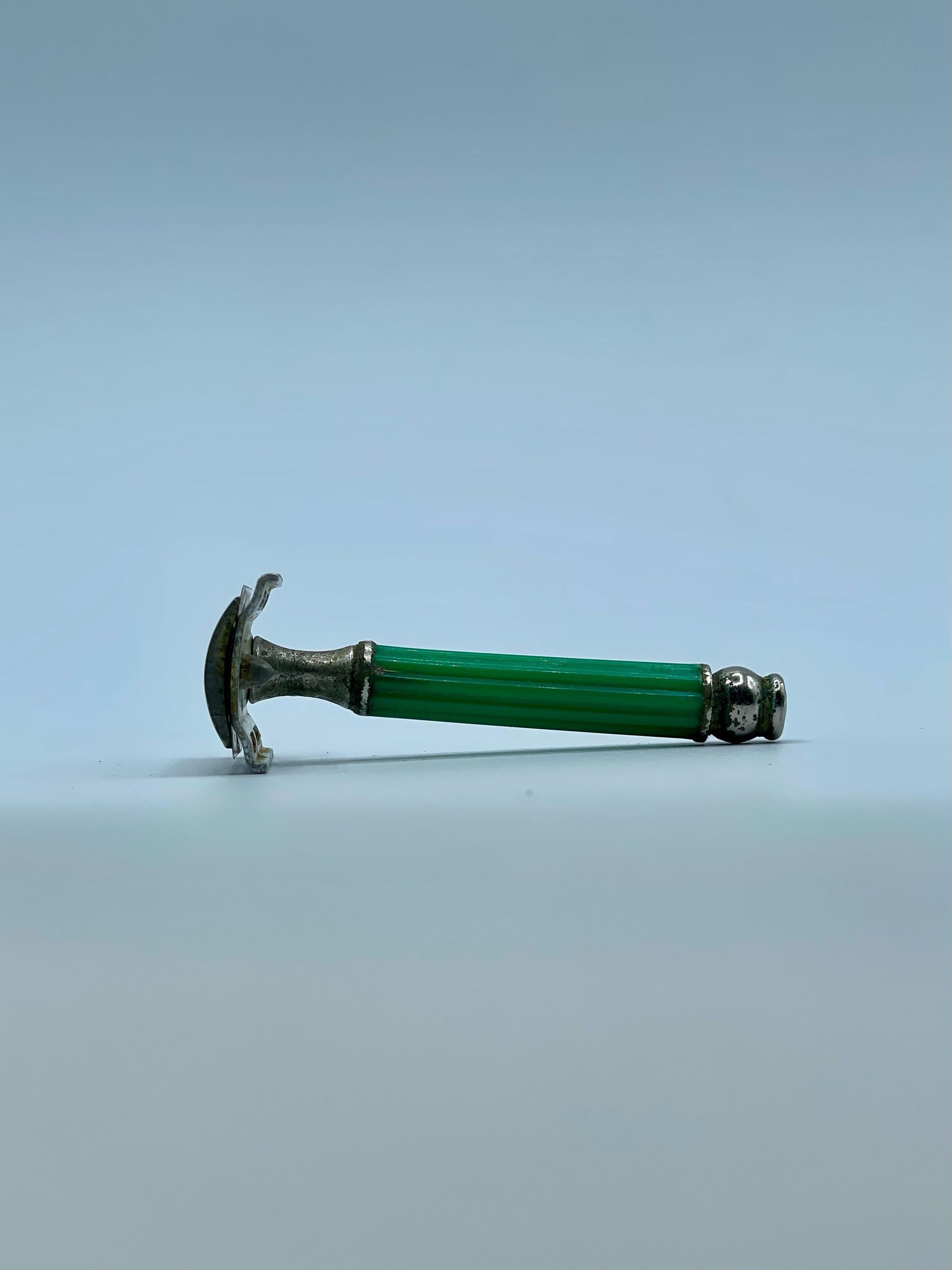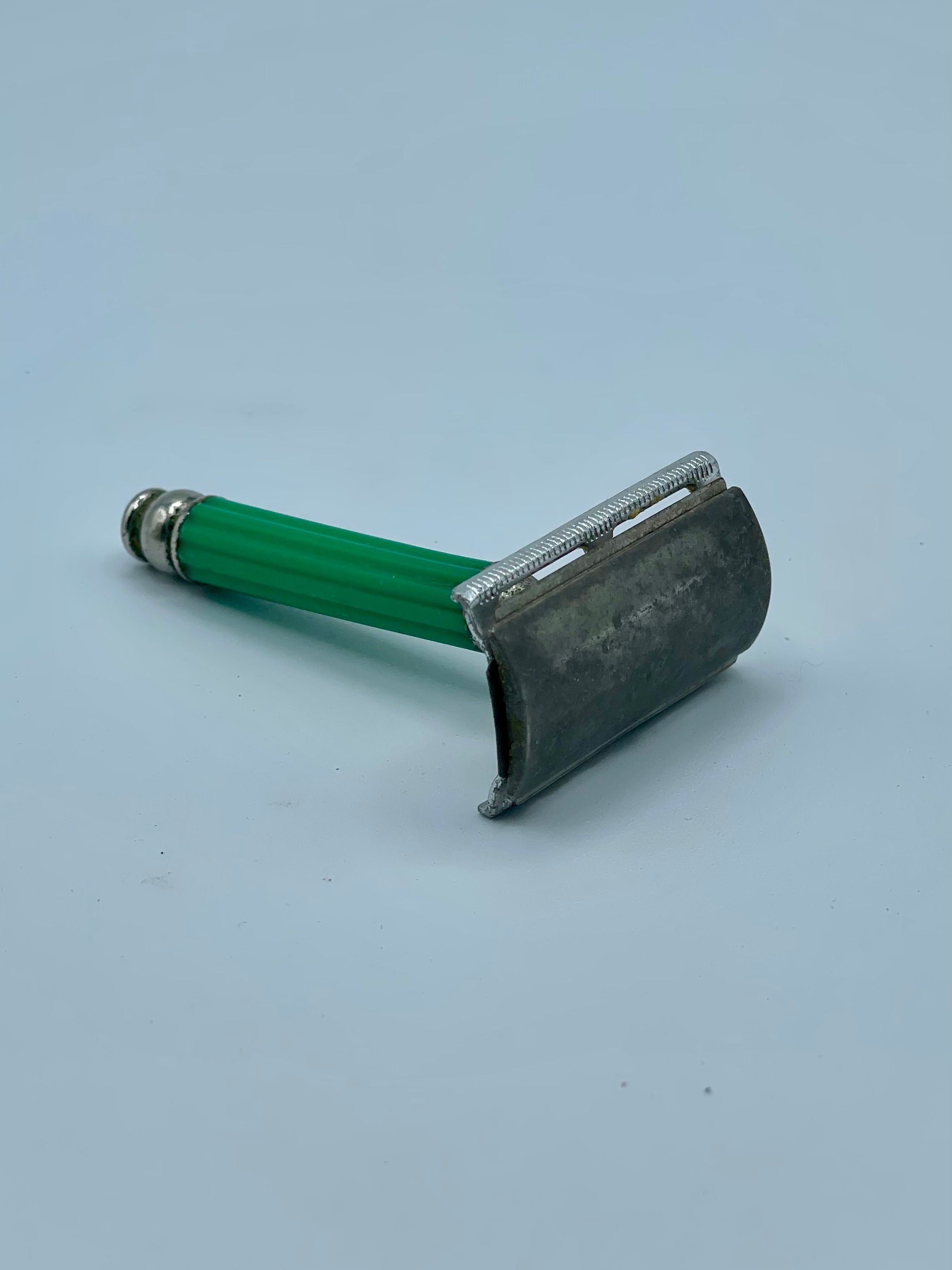 3-piece double-edge (DE) Flying Eagle safety razor with short screw and closed comb, in chromed metal and green plastic.Context