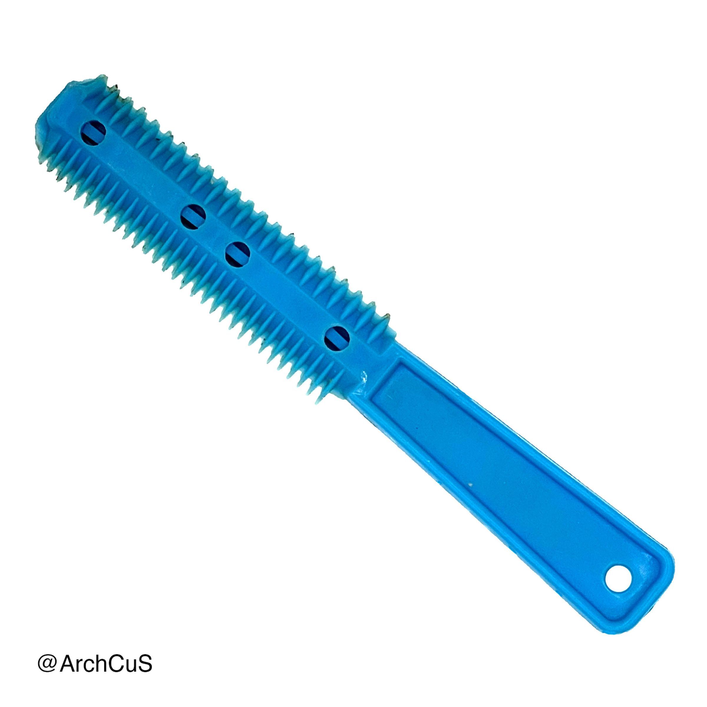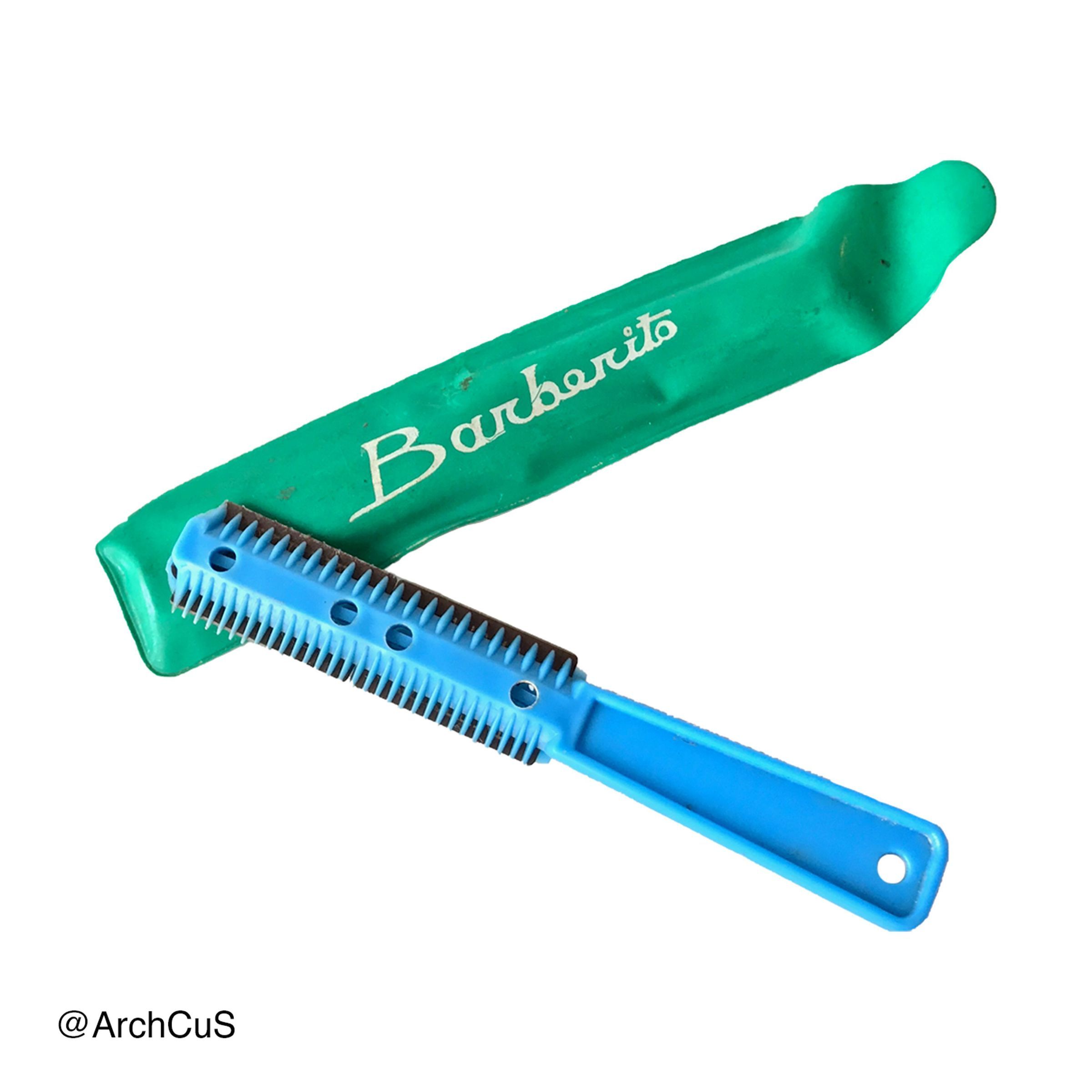 Blue plastic handle to hold two metal double-sided razor blades for trimming hair.Collection