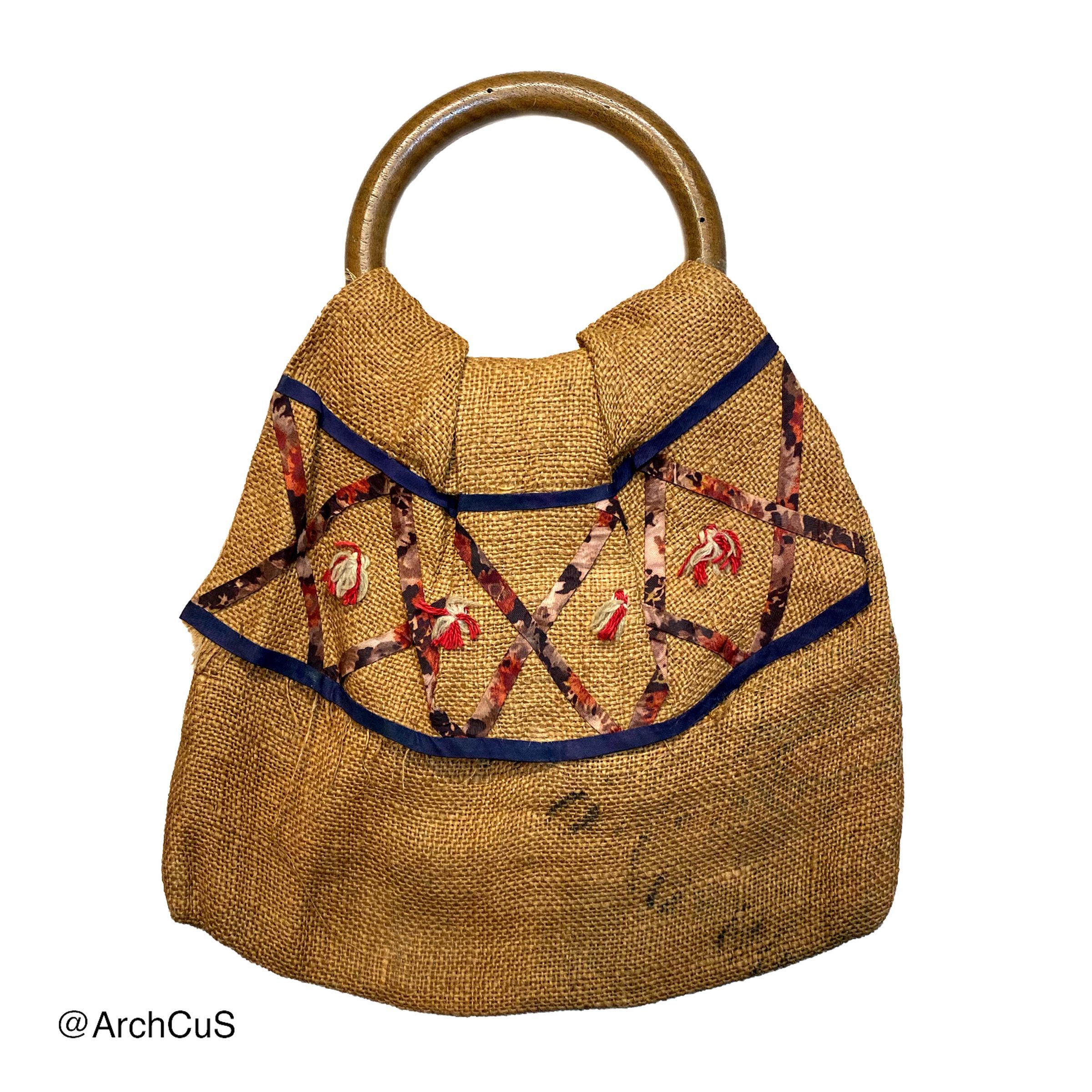 Burlap handbag made with a repurposed sack and decorated with geometric patterns created with fabric obtained from an old dress.Collection