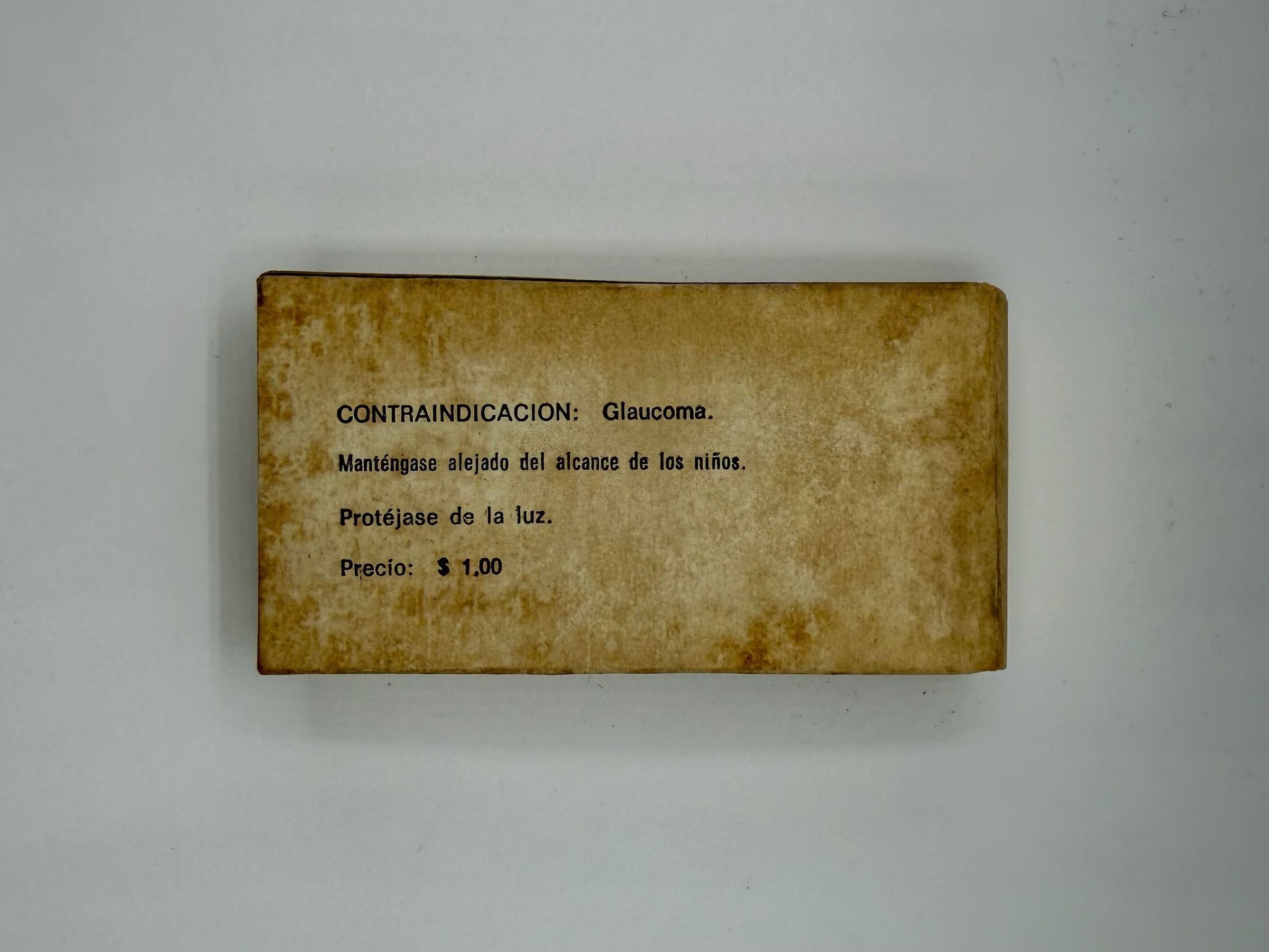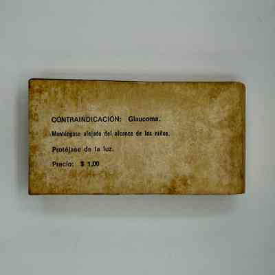 Prescription-only medication produced by the Cuban Ministry of Public Health, Laboratorio Farmacéutico Julio Trigo (Boyeros, Havana). The cardboard box and amber glass bottle list indications, contraindications (glaucoma), storage instructions, and a fixed retail price of $1.00.Collection