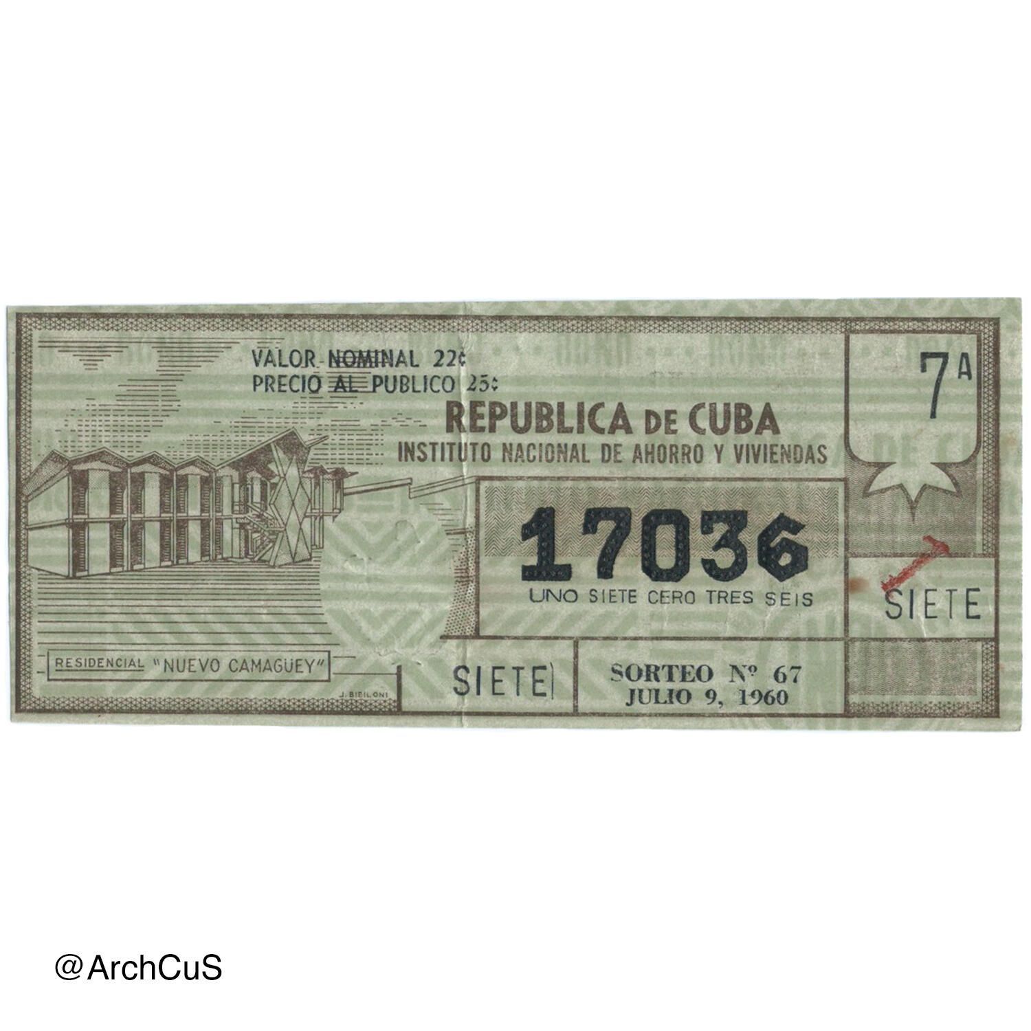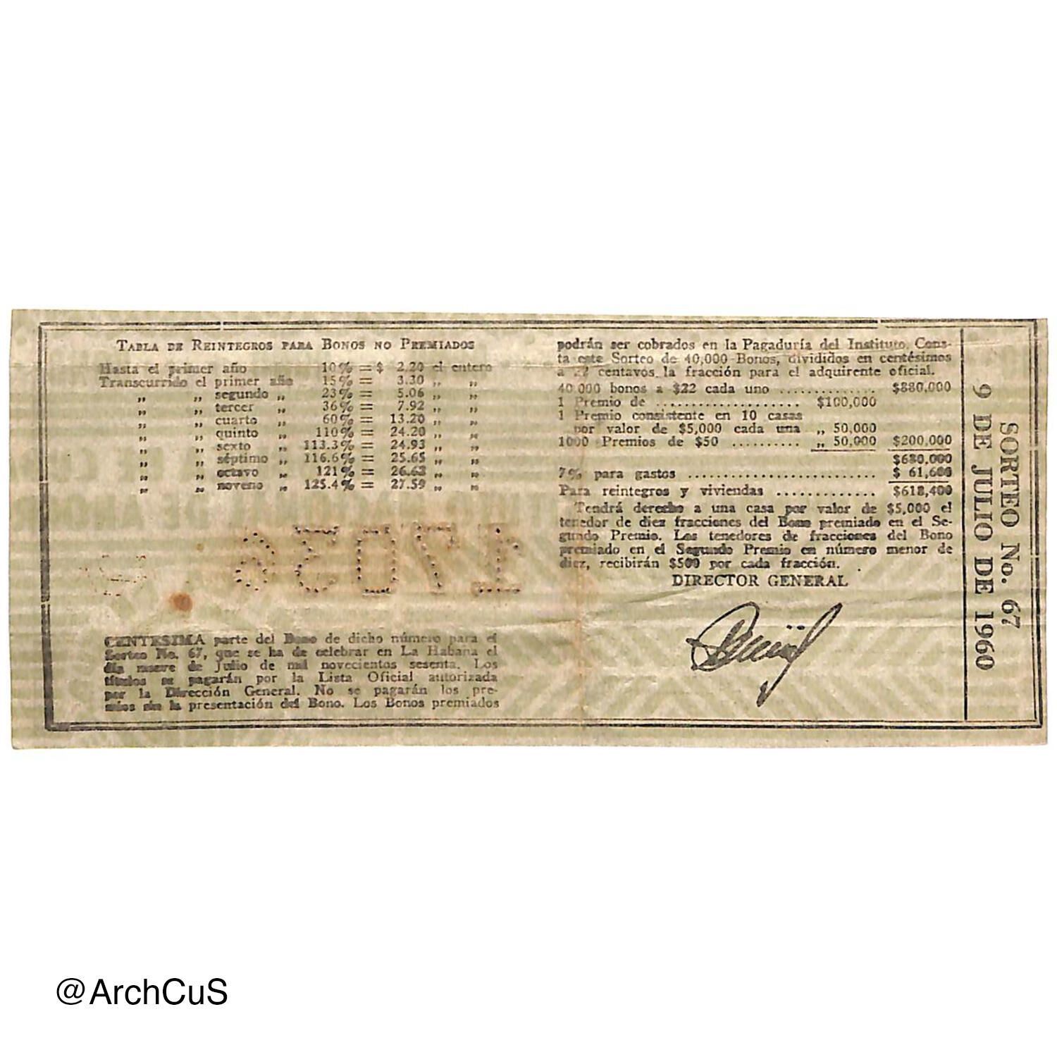 ONE HUNDREDTH part of the Bond of said number for Drawing No. 67, to be held in Havana on July ninth, nineteen sixty. The titles will be paid according to the official list authorized by the General Directorate. Prizes will not be paid without the presentation of the Bond. Winning Bonds may be cashed at the Institute's Paying Office. This Drawing consists of 40,000 Bonds, divided in hundredths of 22 cents the fraction for the official purchaser.