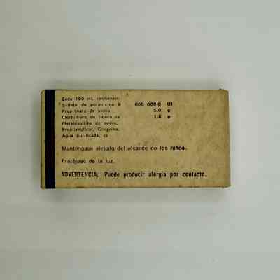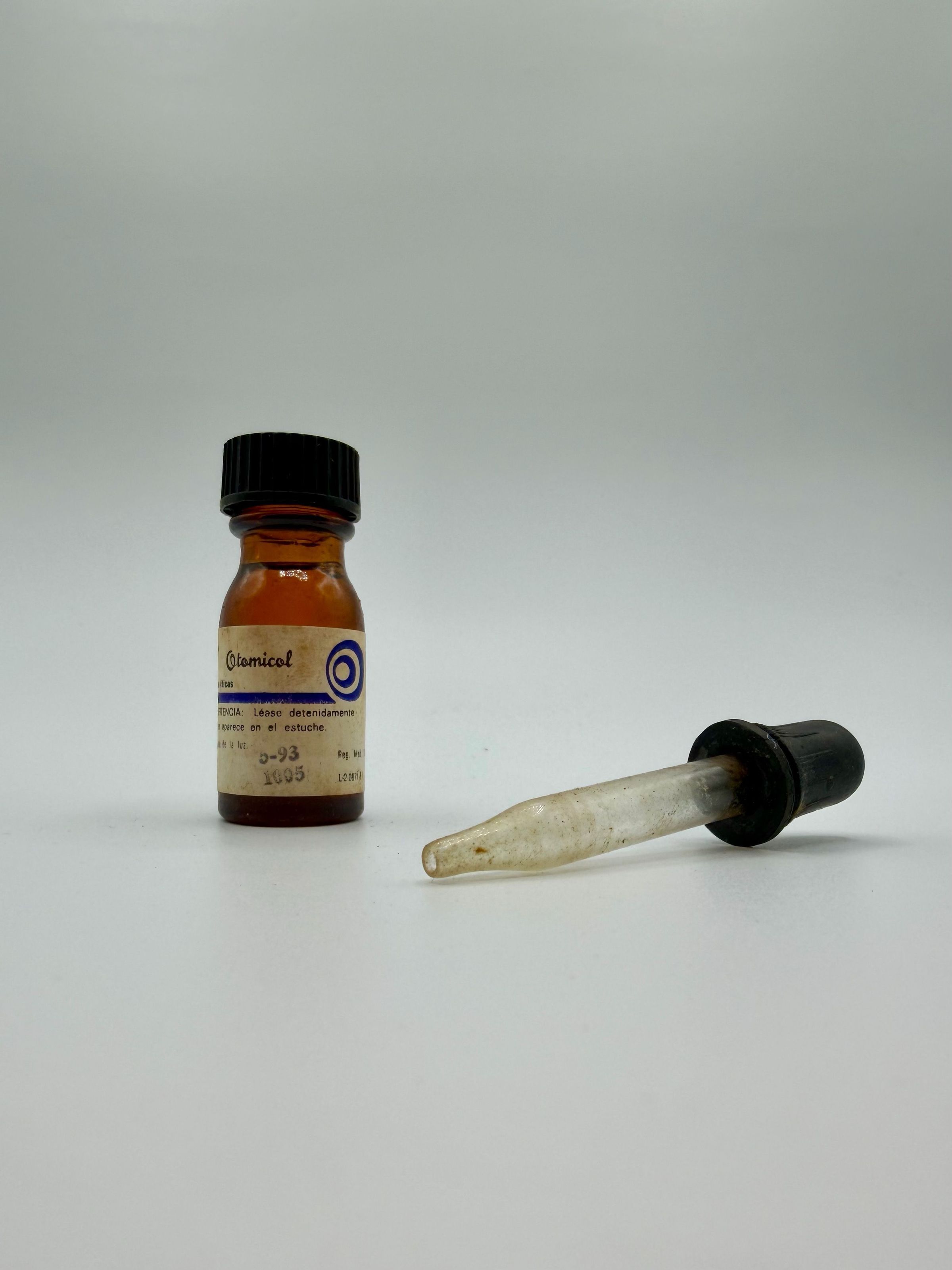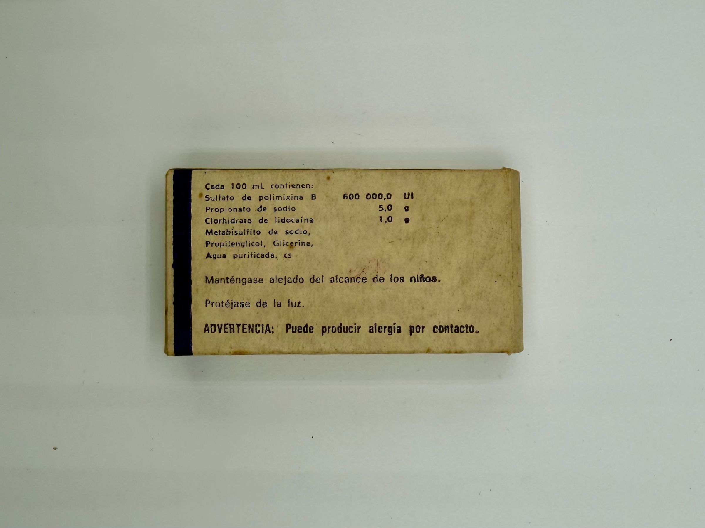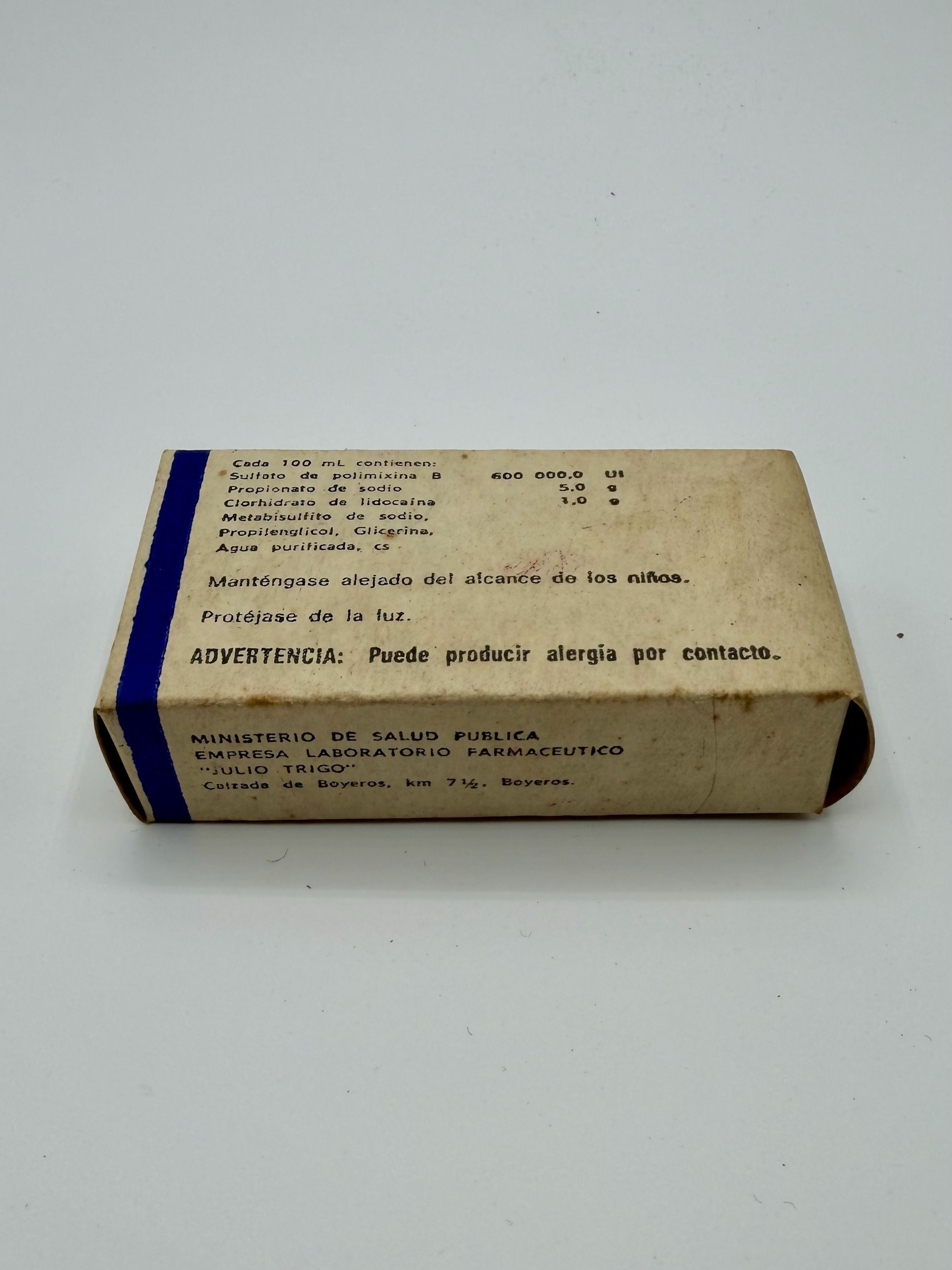 Prescription medication for otic use, combining antibiotics and anesthetic agents (including polymyxin B and lidocaine). Produced at Ministerio de Salud Publica’s Empresa Laboratorio Farmacéutico Julio Trigo in Havana. Expired in May 1993.Collection