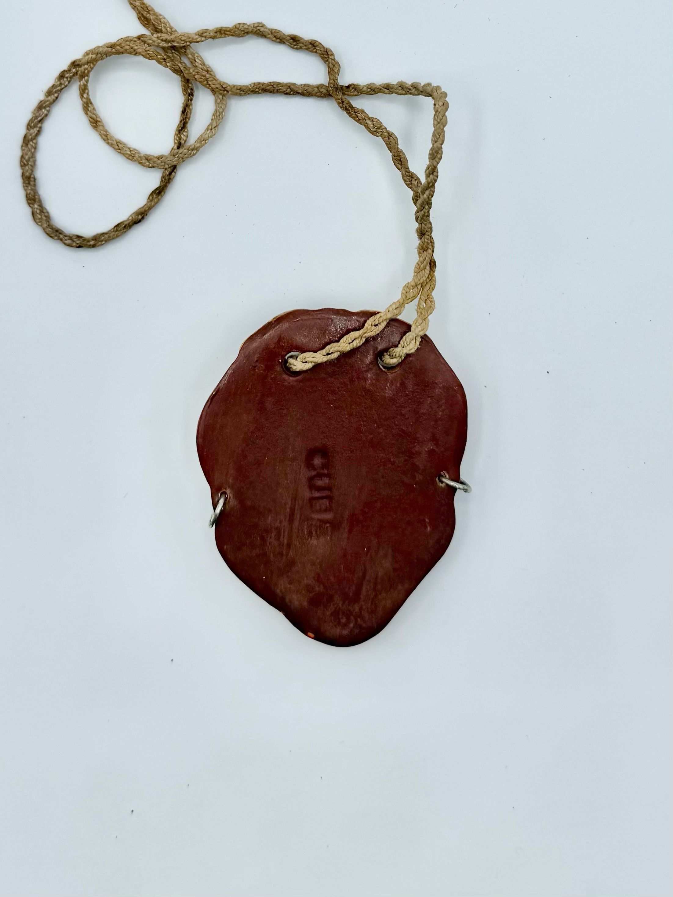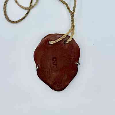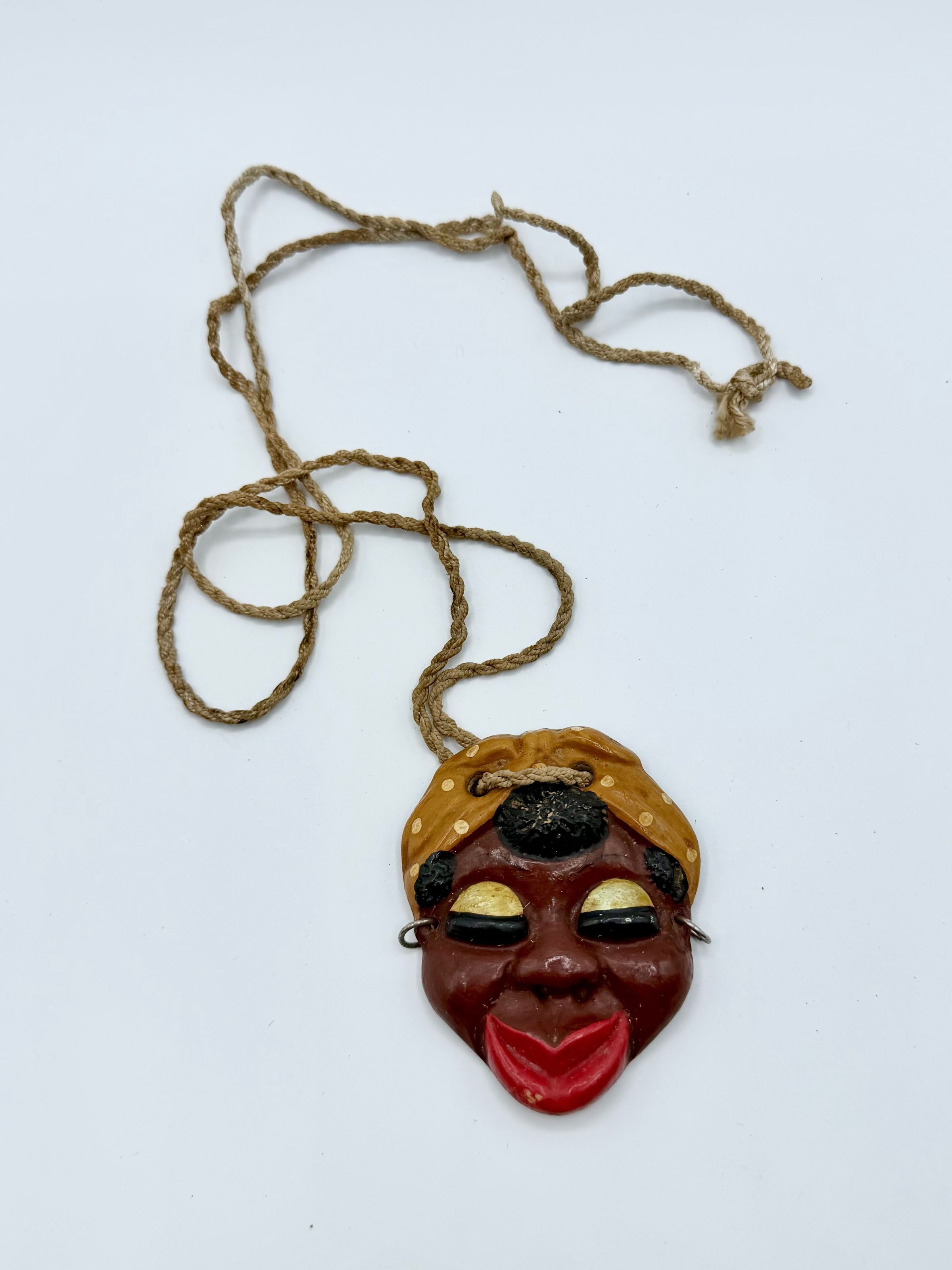 Molded clay pendant depicting the face of an Afro-descendant woman with deliberately exaggerated features. Hand-painted and suspended from a braided cord, the piece transforms a folkloric facial type into a wearable object. Its accentuated lips, eyelids, and headscarf signal both popular craftsmanship and the circulation of racialized visual tropes within vernacular and tourist markets.Acquisition