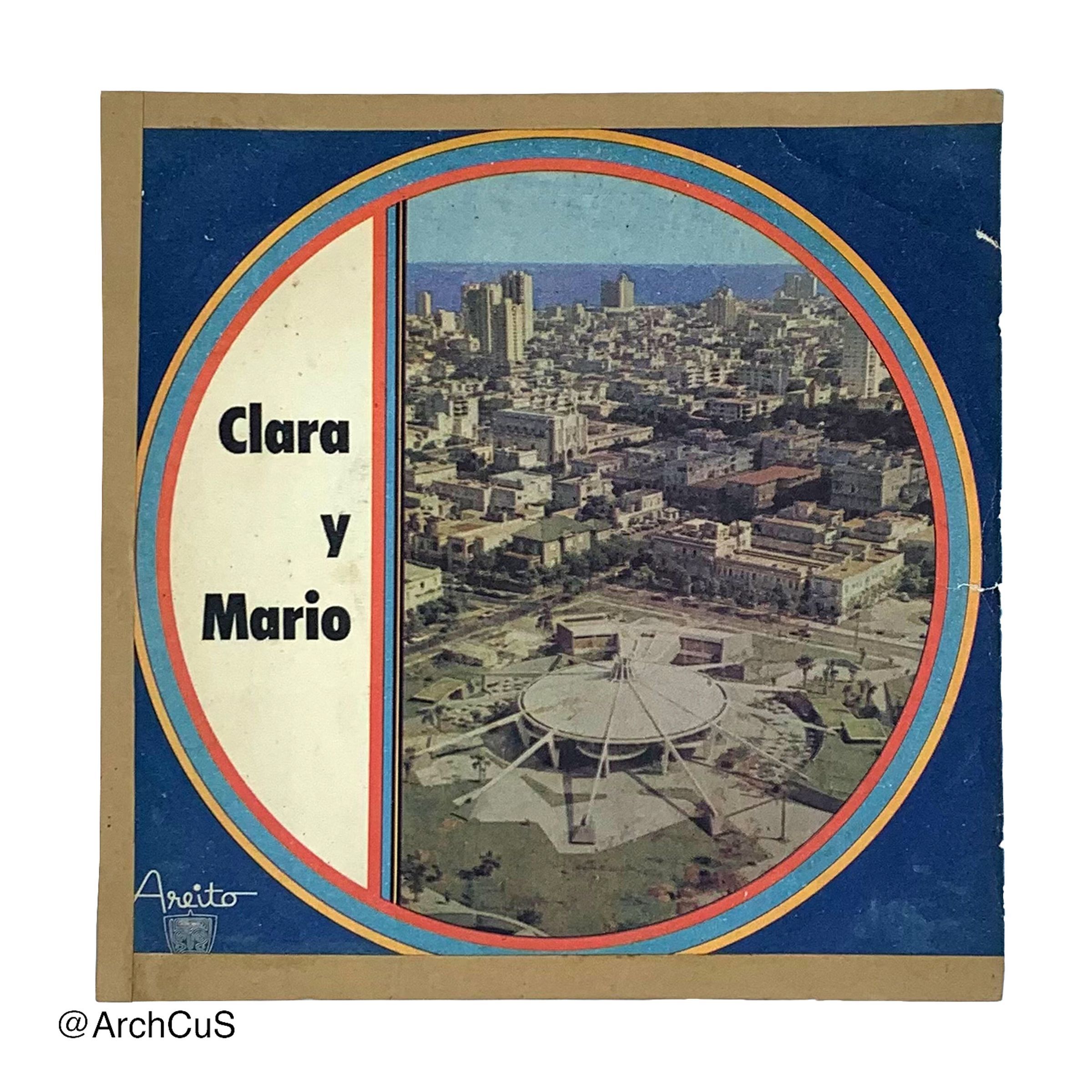 front cover: Geometric design w/ photo of downtown Havana and ice-cream parlor Coppelia; record title (Clara y Mario); record label (Areíto).