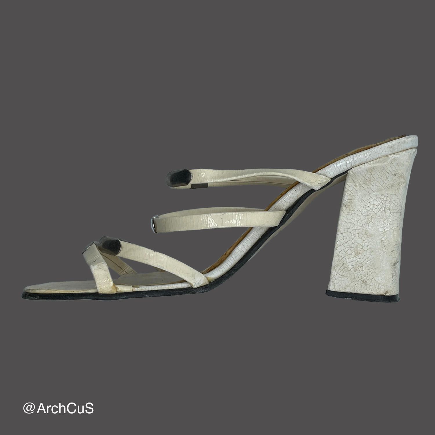 White patent leather strap sandals.Context