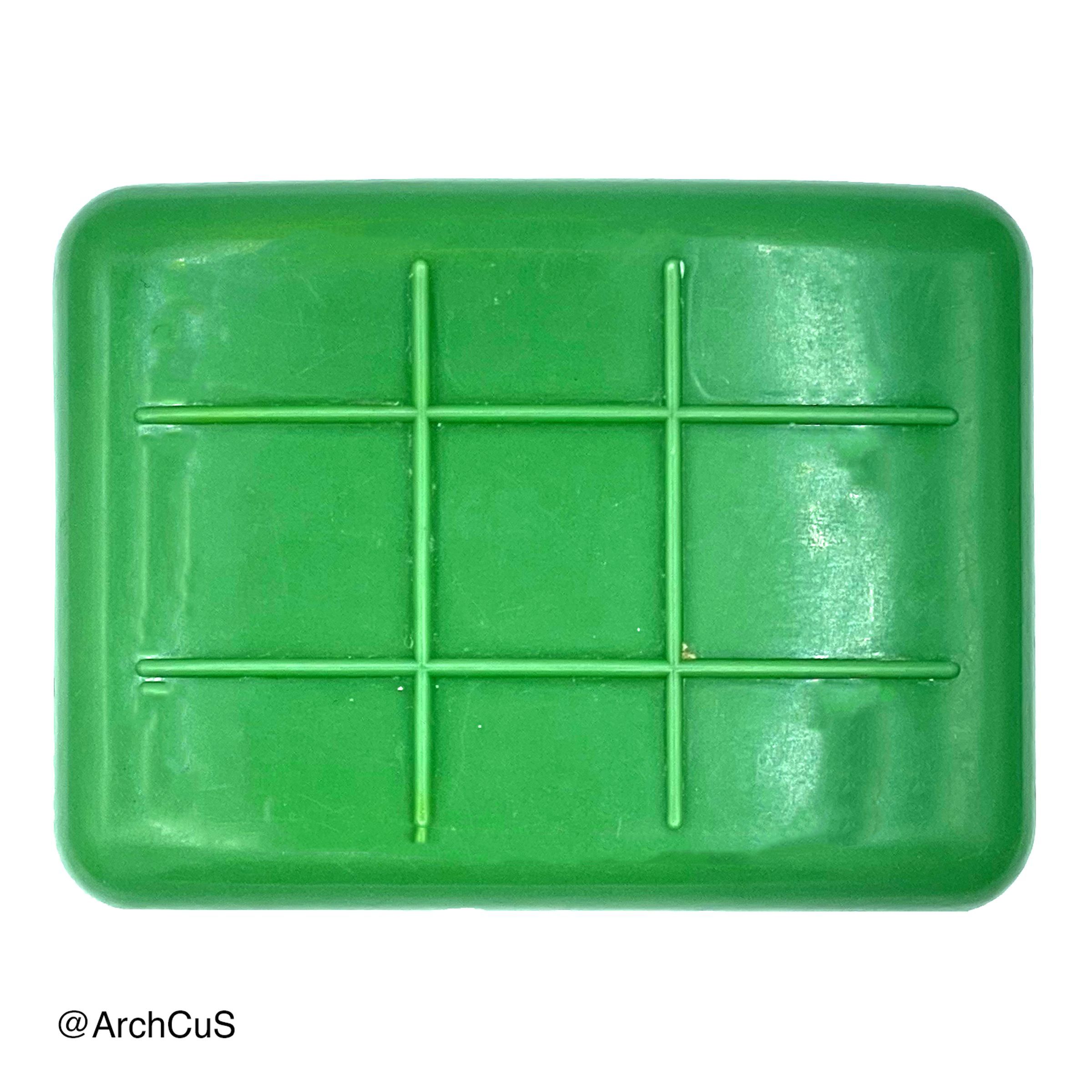 A green soap container with a grid pattern on the lid.Use