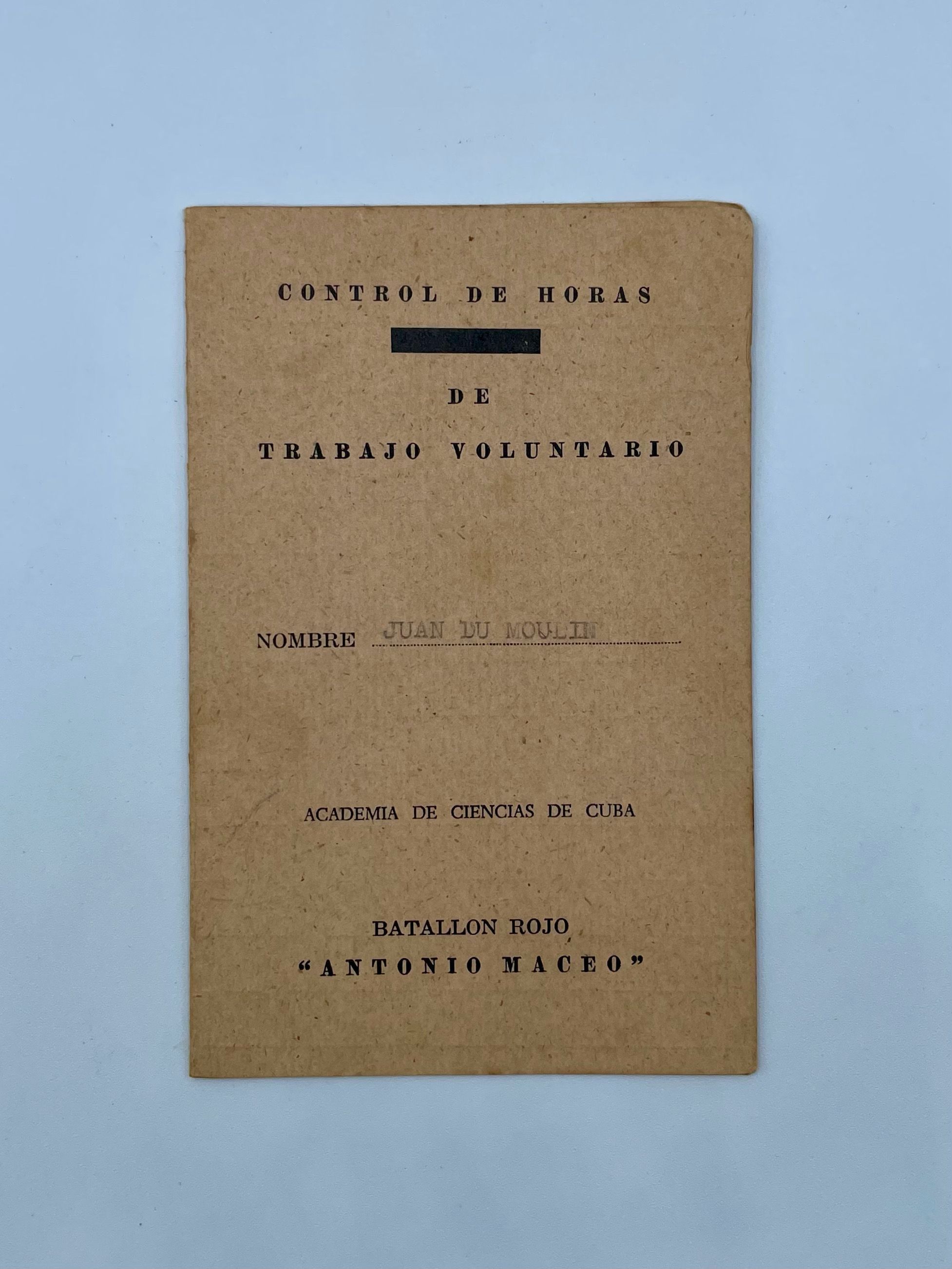 Time-tracking booklet for voluntary labor (Control de horas de trabajo voluntario), c. 1966. Issued by the Cuban Academy of Sciences, Batallón Rojo “Antonio Maceo.” A paper record of political participation, discipline, and unpaid labor.Acquisition