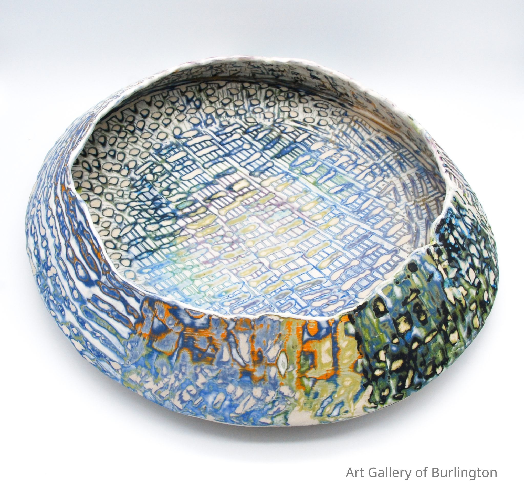Slab built and coil-thrown, hand carved sgraffito, cone 6 white clay, glazes, underglazes, slips | Poterie fabriquée à partir d’une dalle d’argile et spiralée sur tour, argile blanche cône 6, glaçures, sous-glaçure, barbotinesAcquisition