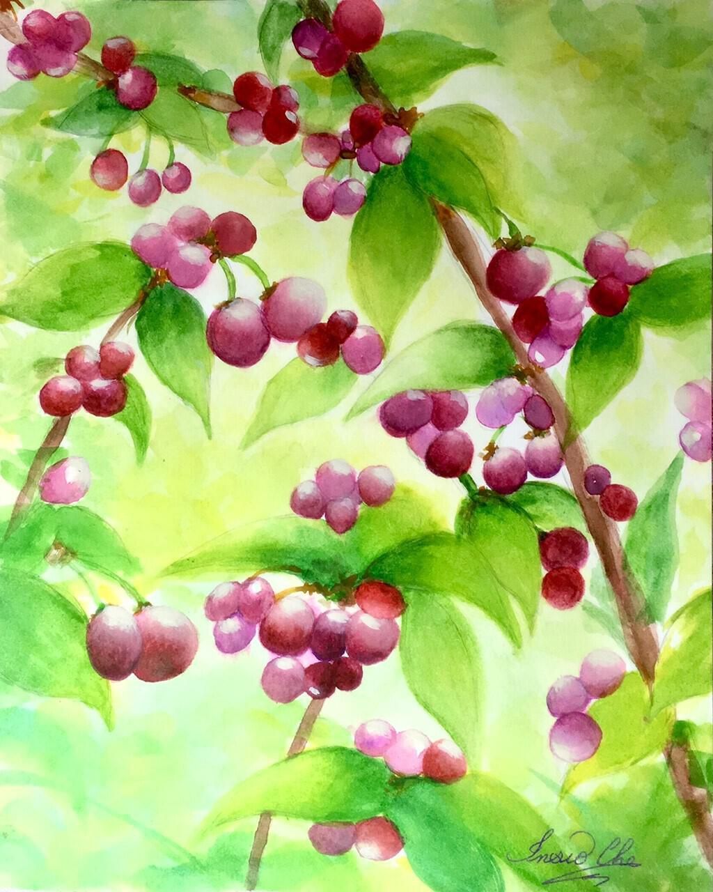 Insio has been teaching with AWE since 2005, this is her first time taking Darcie’s online class with her daughter, Chelsea Lee. They enjoy and appreciate Darcie’s class weekly. Insio completed this “Cherry Blossom” watercolor painting in May (cherry picking season) for the class theme: Nature.