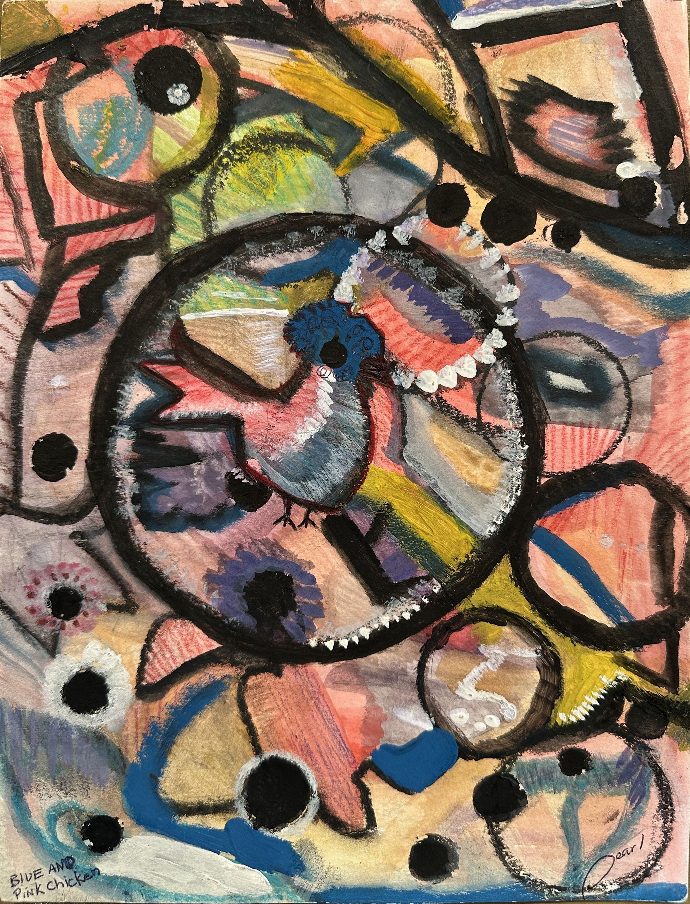 AOSM - Pearl Pooner - Blue and Pink Chicken - 9x12 Mixed Media - Selected
