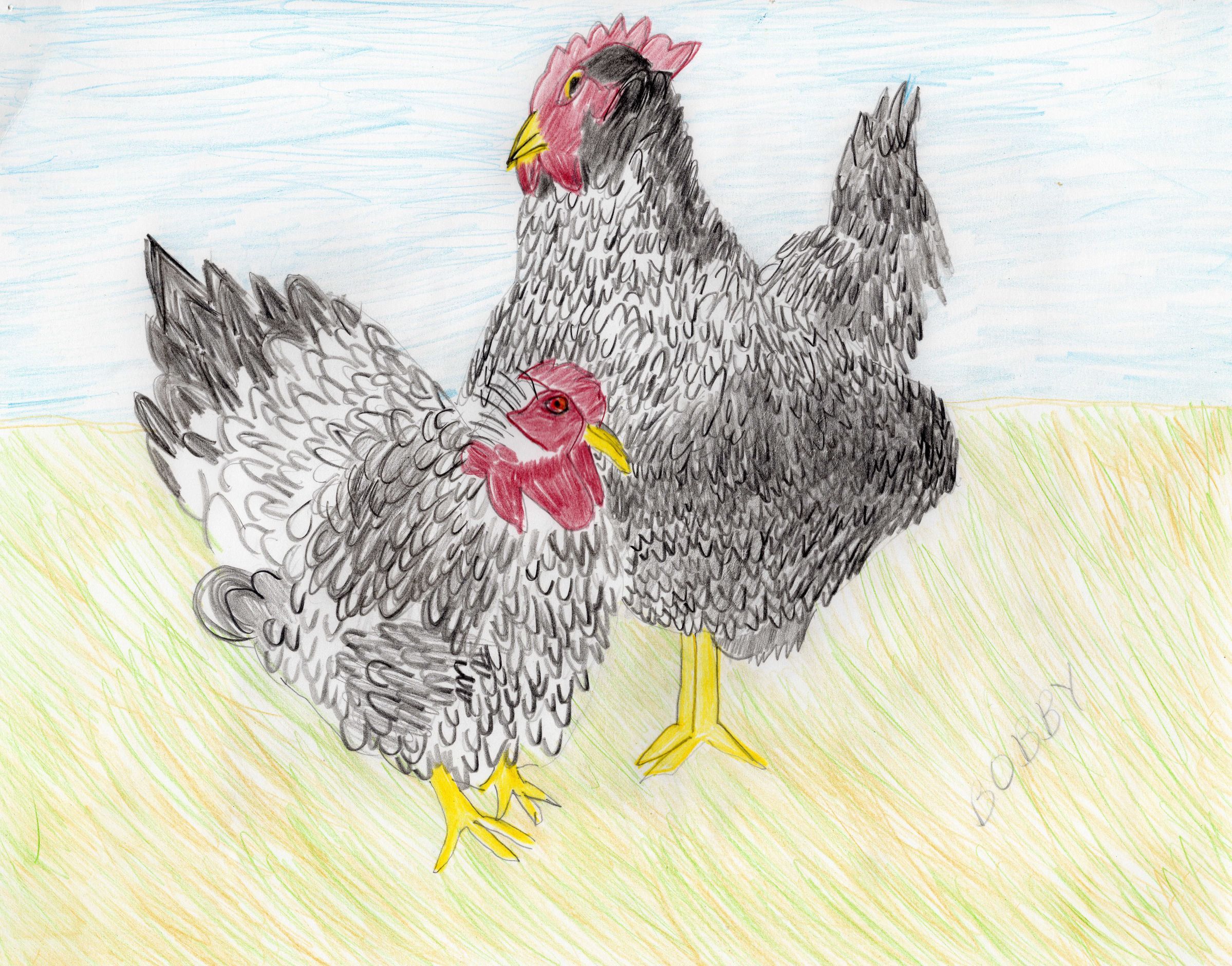 “Chickens in the Backyard,” Bobby’s drawing in colored pencil, is based on photographs of Trixie and Pearl, chickens who belong to Aspen’s activities director, John Suus.
