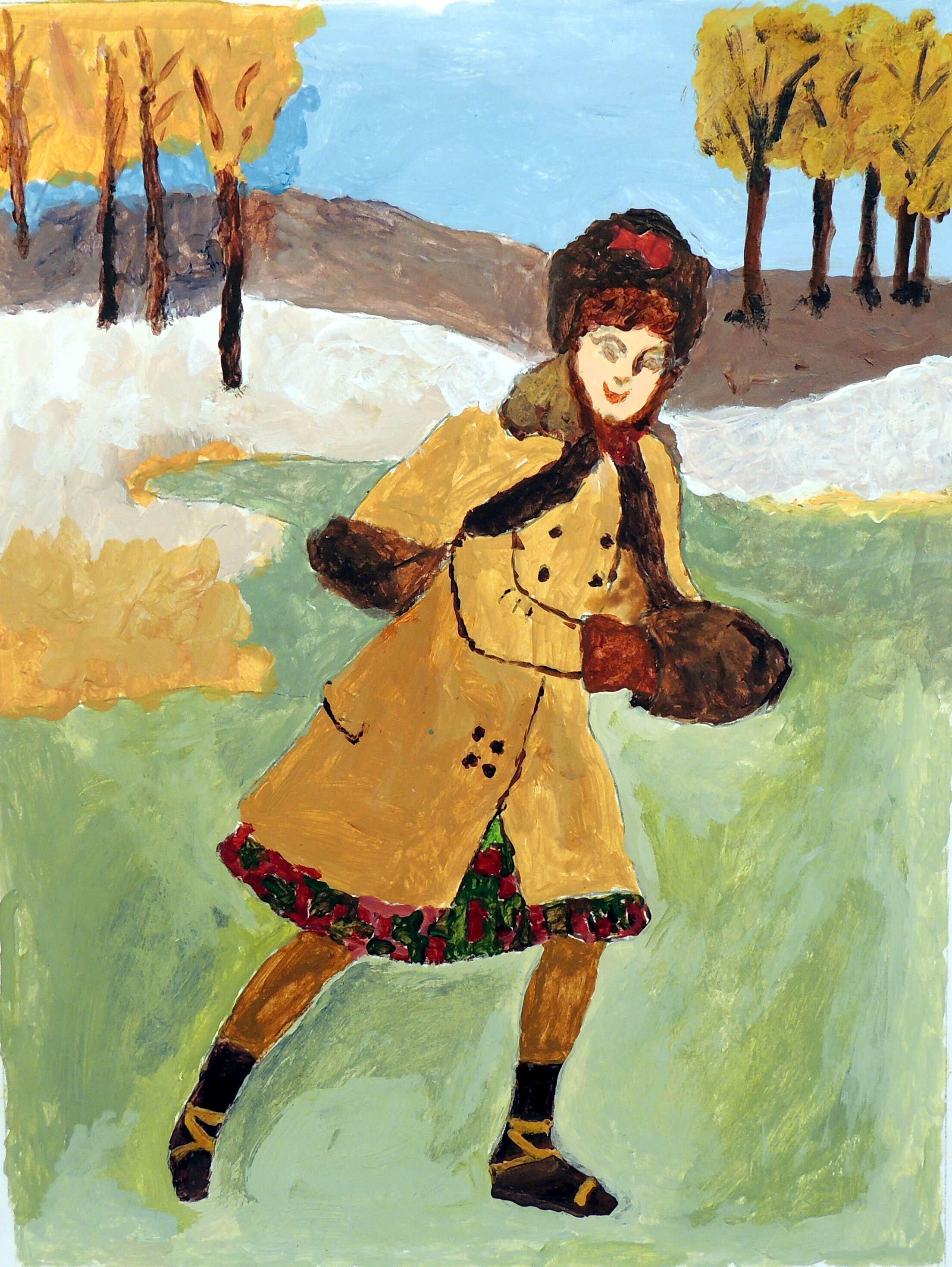 Of her art, Lorraine says, “I’ve always scribbled a bit, but never had a chance to really sit down and work at it. It’s a miracle.” Lorraine enjoys painting flowers and buds, because “they’re the most colorful,” but has begun experimenting with portraits and figures – like this one. She likes copying images but changes some aspect of them to make them her own.
